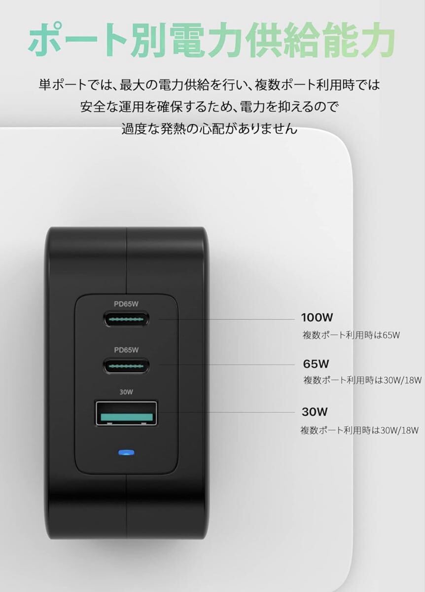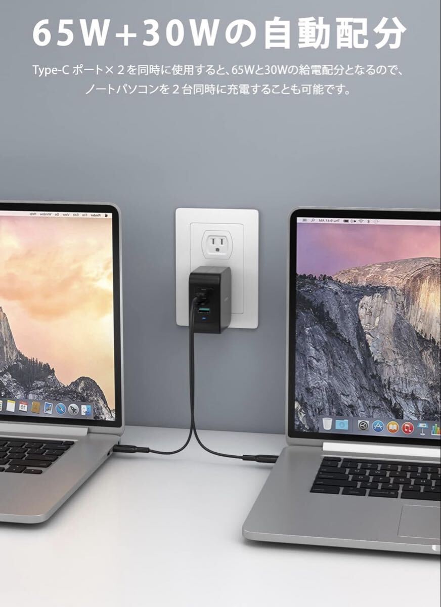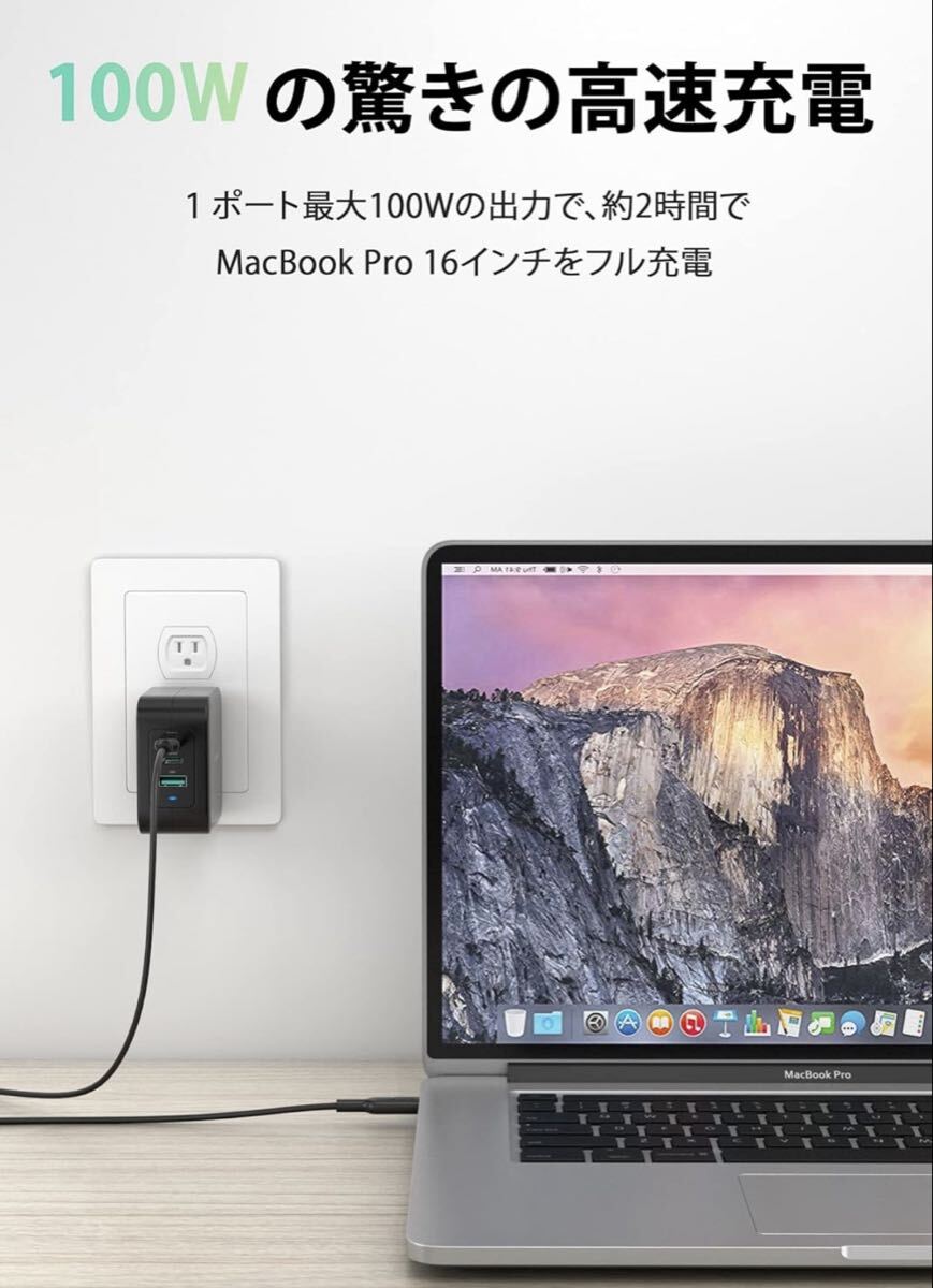USB-C PD3.0に対応し、単ポート最大100Wで出力可能。高出力が必要な高性能ノートPCでも短時間で急速充電。96W出力が必要なMacBook Pro 16を約2時間でフル充電。また、Type-C 65W + Type-C 30W の2ポートの場合でも、最大95Wまでデバイスを充電することが可能です。