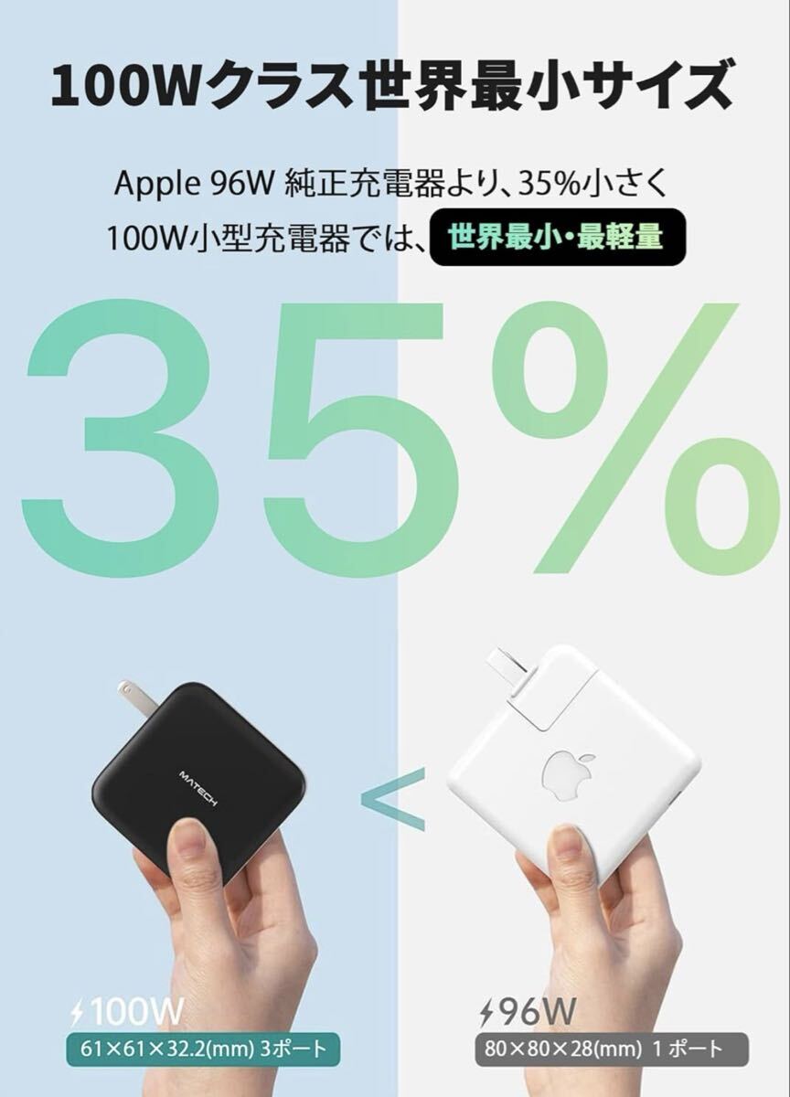 96WのApple 純正充電器よりも約35%小さく、また、重量も約35%軽くなりました。(※2022/2/22 時点 自社調べ)