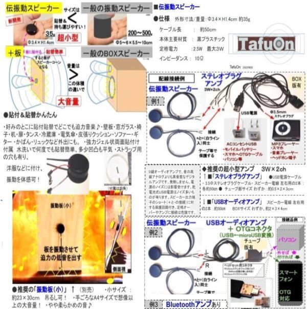 ●特徴 ①貼替かんたん 付属の粘着ジェルで好みの板状品に貼付&貼替で、どこでも迫力音楽! ♪ 壁板・窓ガラスなどに音の振動を伝えて、スピーカーコーンの代わりをさせ、超小型で大音量 ②小型もはやスピーカーBOX不要!場所を取らない 持ち運びしやすい! スマートな近未来品! 小型大音量!♪ ③スマホからも大音量!充電不要USBオーディオアンプ別途対応 わずか3W、だからスマホから別途出品の「USBオーディオアンプ」で充電不要に対応! 音楽の振動体感、リズム取り、お知らせなどにも利用可能! ⇒こちらがUSBオーディオアンプ ⇒ステレオプラグアンプ ⇒Bluetoothアンプ |