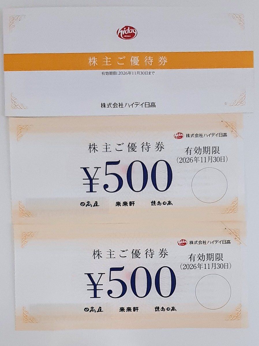 ハイデイ日高株主優待券5000円分(500円券×10枚)です。ハイディ日高が経営する各店舗でご利用いただけます。有効期限は2026年11月30日までとなっております。ご利用方法等につきましては,券面記載内容(画像)をご確認ください。