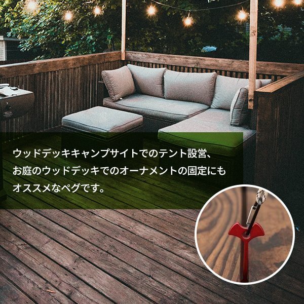 ウッドデッキキャンプサイトでのテント設営、お庭のウッドデッキでのオーナメントの固定にもオススメなペグです。カラー:レッド