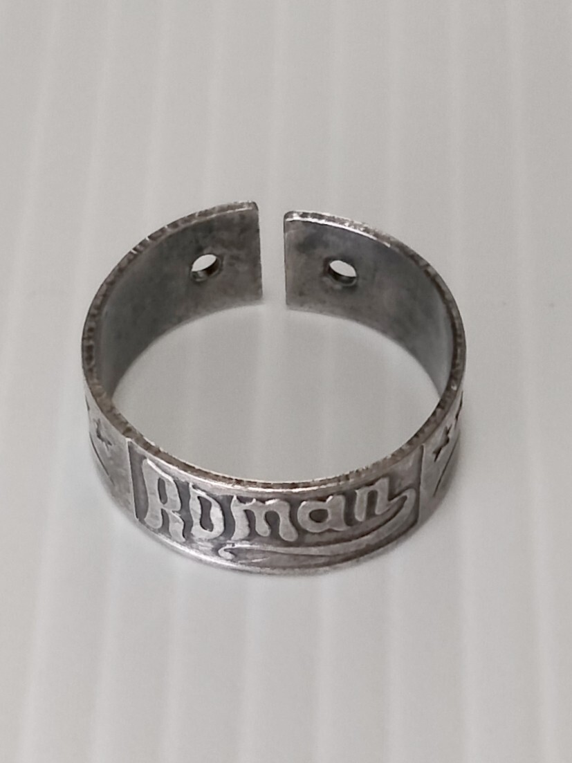 サイズは15〜19位まで調整可能、リング幅7mm,素材は不明。