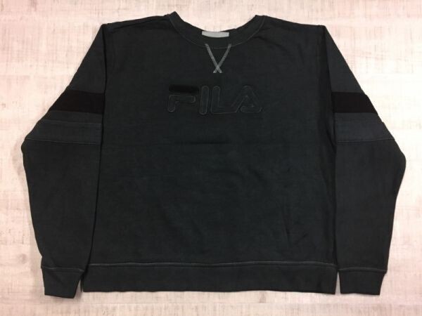 フィラ FILA ロゴ刺繍 袖ライン 裏起毛 オールド レトロ 古着 アメカジ ストリート ショート丈 スウェット トレーナー メンズ XL 墨黒 です。