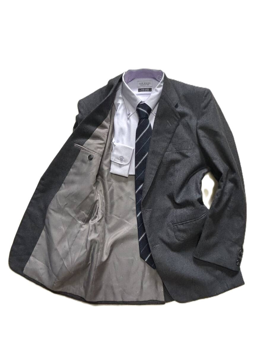 ■ 特徴:メンズ用テーラードジャケット。前2つ釦,センターベント,総裏,袖4つ釦。色はグレー。冬用
