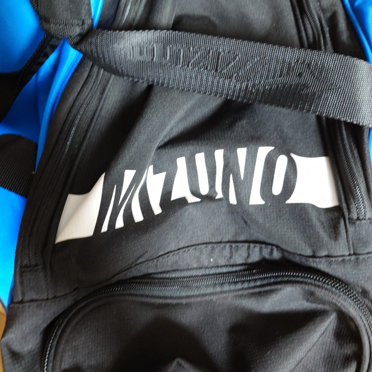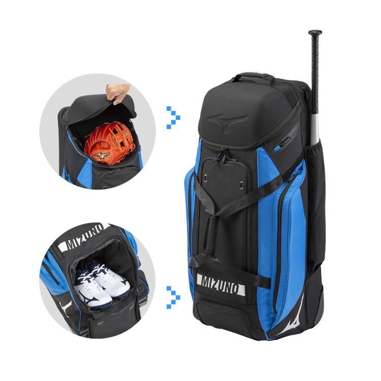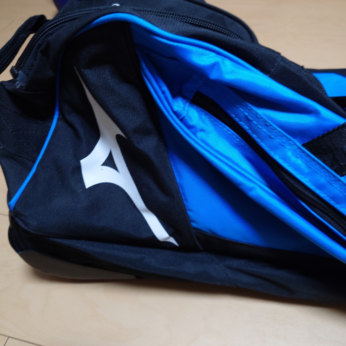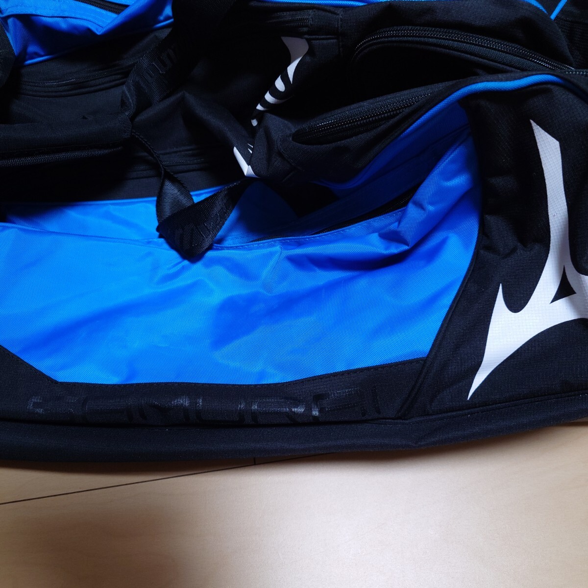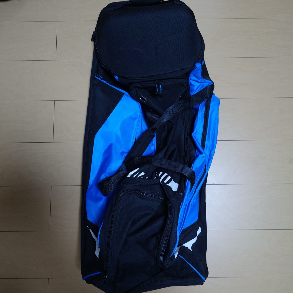 Mizuno製の青黒の遠征バッグで、靴やバットの収納が可能。
