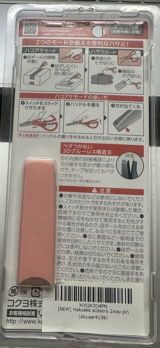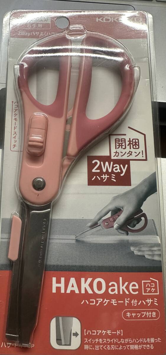 【型番】ハサ-P410P  ●2つのモードで使える便利なハサミです。 ●「ハコアケモード」は、本体のスイッチをスライドしながら握ると出てくる約1mmの刃によって、ハサミの刃を閉じたまま段ボールの開梱できるモードです。 ●「ハコアケモード」にした状態から、ハンドルの握りをゆるめると自動的に刃がでない状態に戻る安心に配慮した設計です。 ●刃にブレードガードが付いているので、「ハコアケモード」時に人差し指を当てて使用することができます。 ●刃の接する面積を最小限に抑えた「3Dグルーレス構造」により、粘着テープなどを切っても刃の接する部分にのりが付きにくくベタつきません。 ●キャップ付です。  色:ピンク 刃渡り:65mm 全長:177mm 材質:刃部:ステンレス、ハンドル部:ABS、リング部:エラストマー、スイッチ部:POM、キャップ:PP 備考:※全長はキャップなしの寸法。