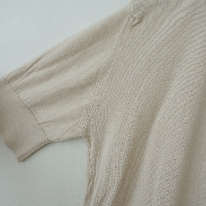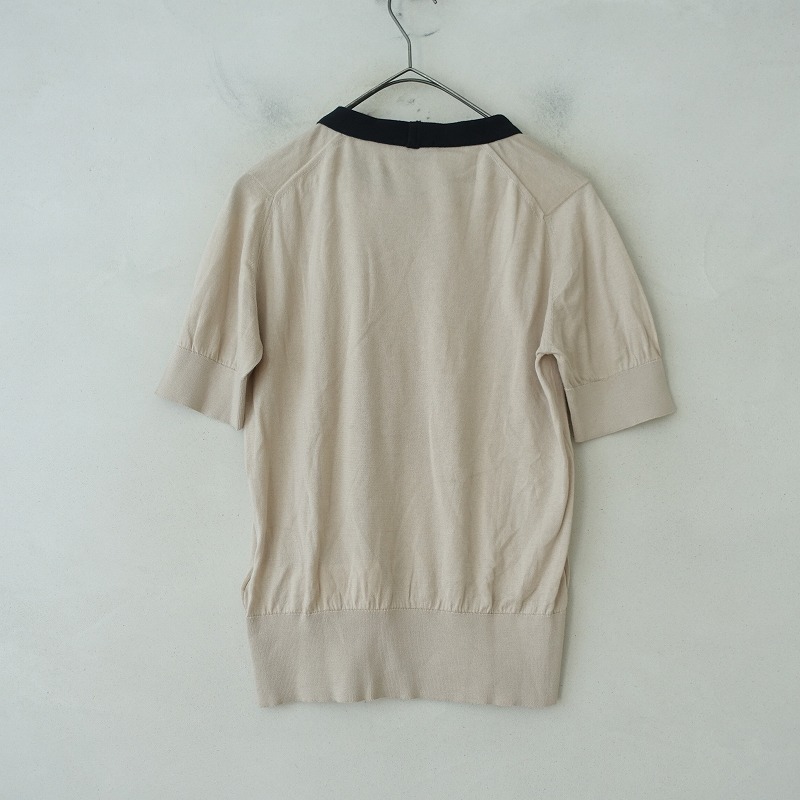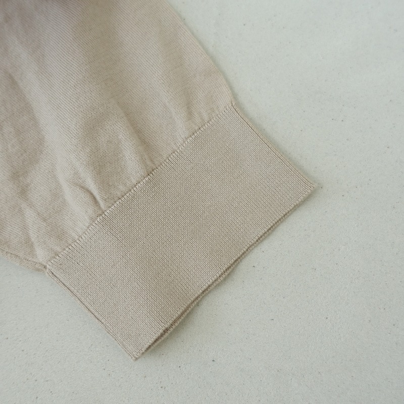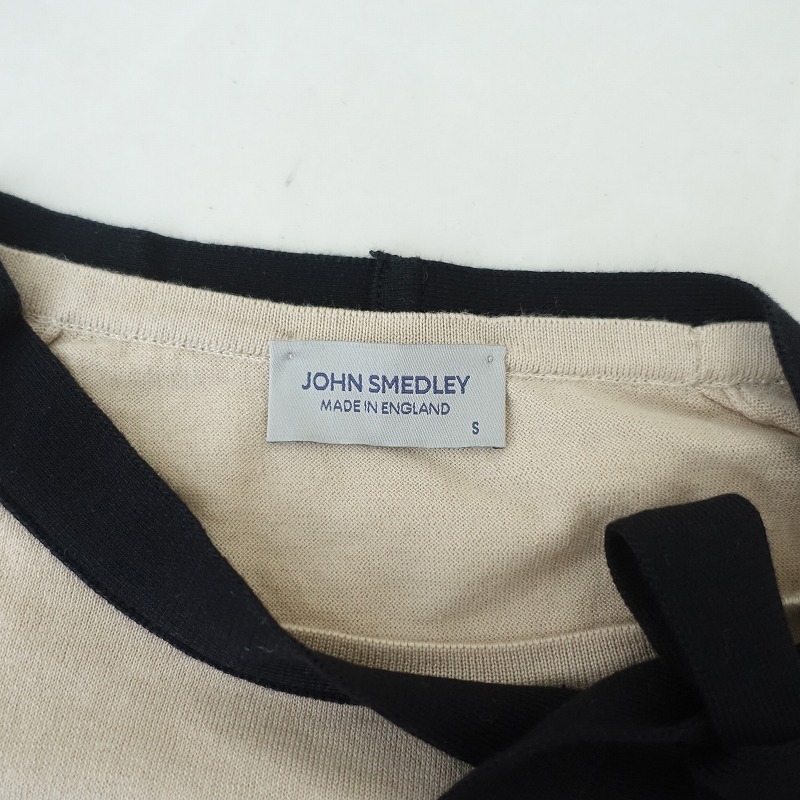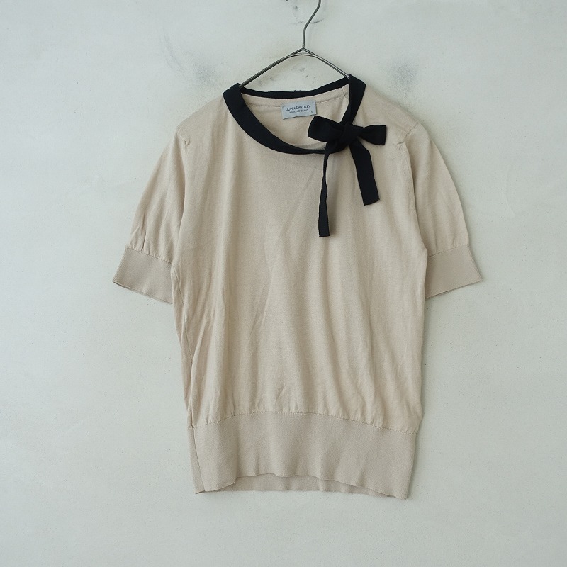 | JOHN SMEDLEYのBicolour Tie neck Sweaterです。カラーはベージュで、薄手のニット素材です。プルオーバータイプで、ネックラインからのブラックのリボン紐をフロント左サイドで結んで着用していただけ、袖口&裾はリブ編み仕様になっております。定価(メーカー希望小売価格)41800円の商品です。 |
