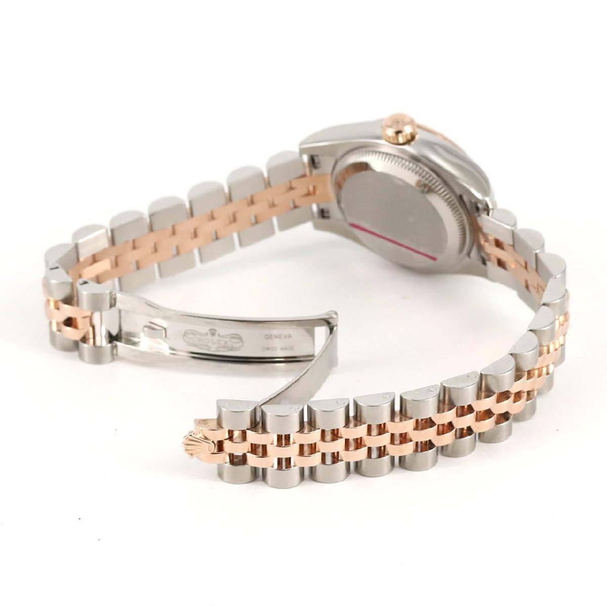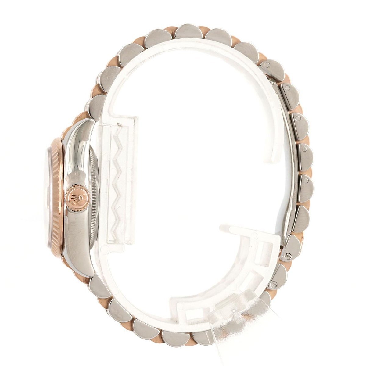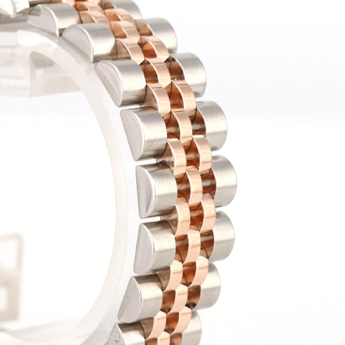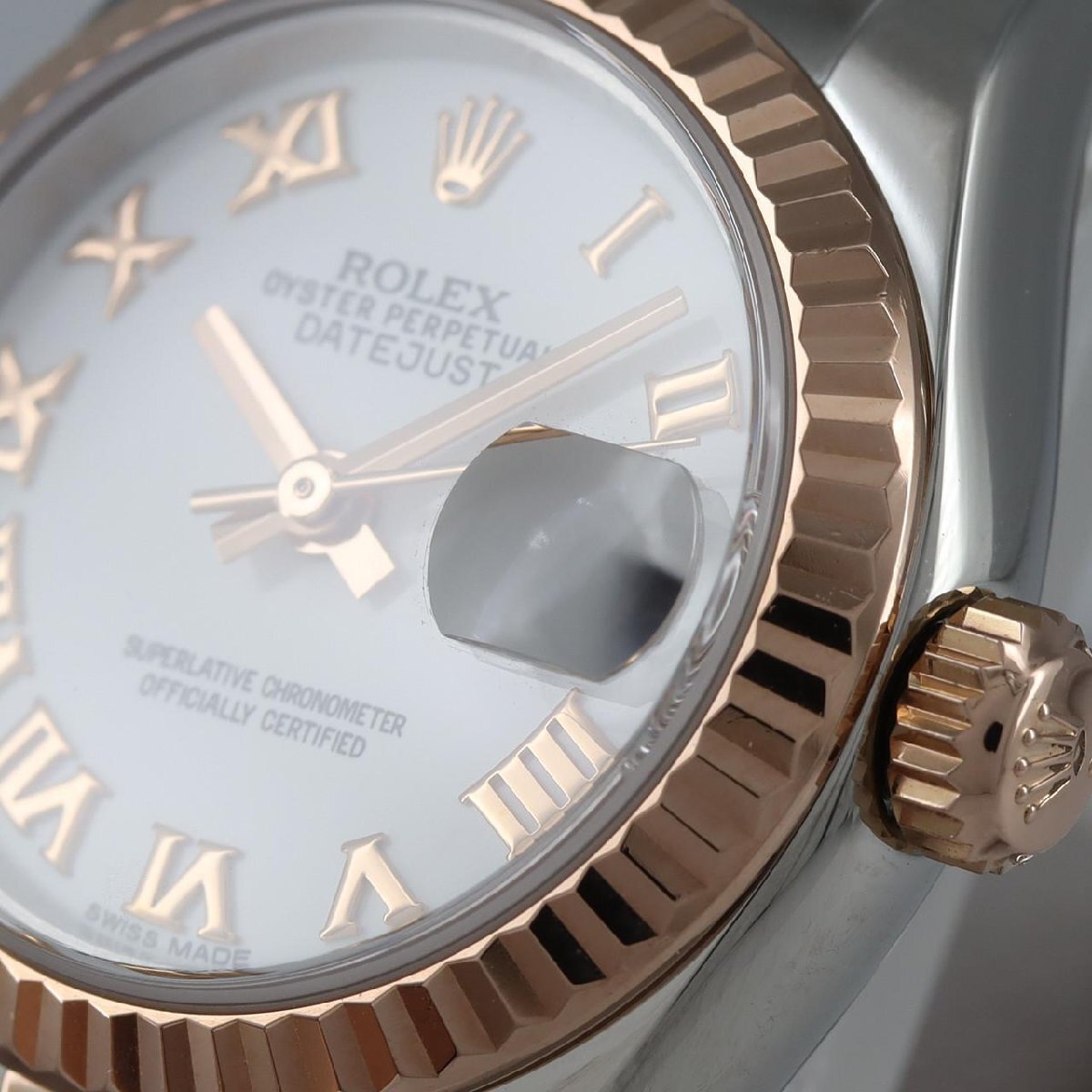 2005年頃に登場した、26mm径の「レディ デイトジャスト」。ベゼルとブレスレットの中央コマに、肌馴染みの良いエバーローズゴールドを使用したロゾール仕様です。視認性の高いホワイトダイヤル上で立体的なローマ数字が輝き、手元に知的な印象をプラス。エレガントな5連のジュビリーブレスレットと高信頼性のキャリバー2235を組み合わせた、気品と実用性を兼ね備えたタイムピースです。