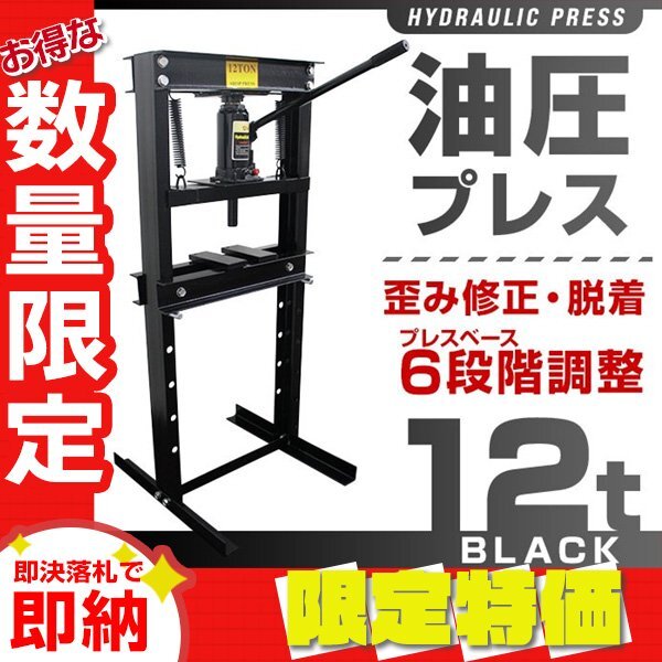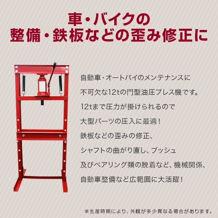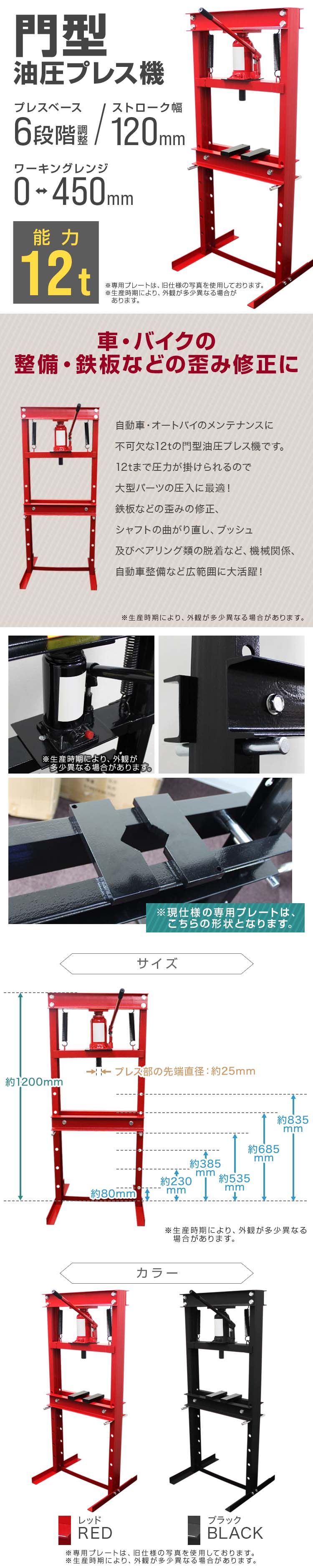 自動車・オートバイのメンテナンスに不可欠な油圧プレス 12tです。 12tまで圧力が掛けられますので大型パーツの圧入に最適です! 鉄板などの歪みの修正、シャフトの曲がり直しや ブッシュ及びベアリング類の脱着など、機械関係、自動車整備など広範囲に大活躍です! ■商品仕様 ・サイズ:(約)幅500×奥行き550×高さ1200mm ・重量:(約)43kg ・能力:12t ・ワーキングレンジ:0~450mm ・ジャッキ部延び幅(ストローク):(約)120mm ・テーブル穴間隔:(約)15cm ・カラー:ブラック/黒 ・ 専用プレート2枚付き ■注意事項 ・組み立てが必要です。 ・大型商品なので大人2人以上での組み立てをお勧めします。 ・写真と実物は多少異なる場合がございます。あらかじめご了承下さい。 ■メーター付き12t油圧プレスは こちら→ ■20t油圧プレスは こちら→ ■メーター付き10t油圧プレスは こちら→ ■油圧プレス用リングアタッチメントは こちら→ |