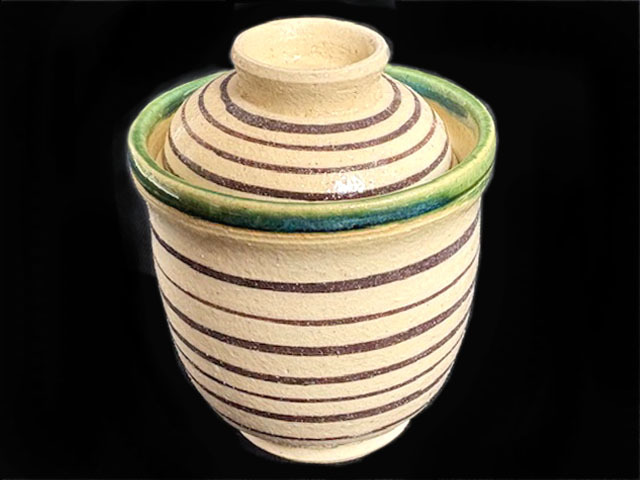 緑と茶とベージュの織部焼です。