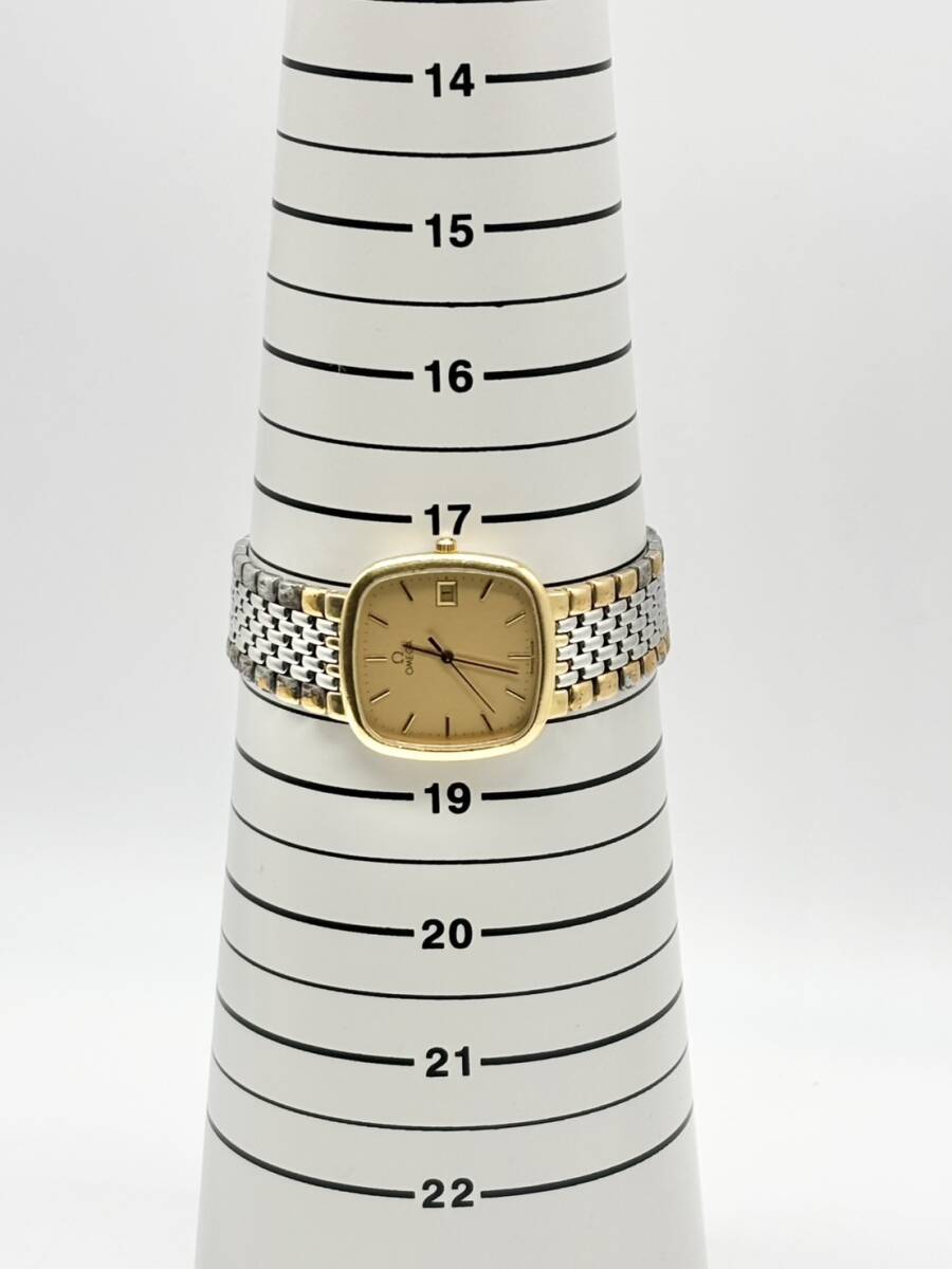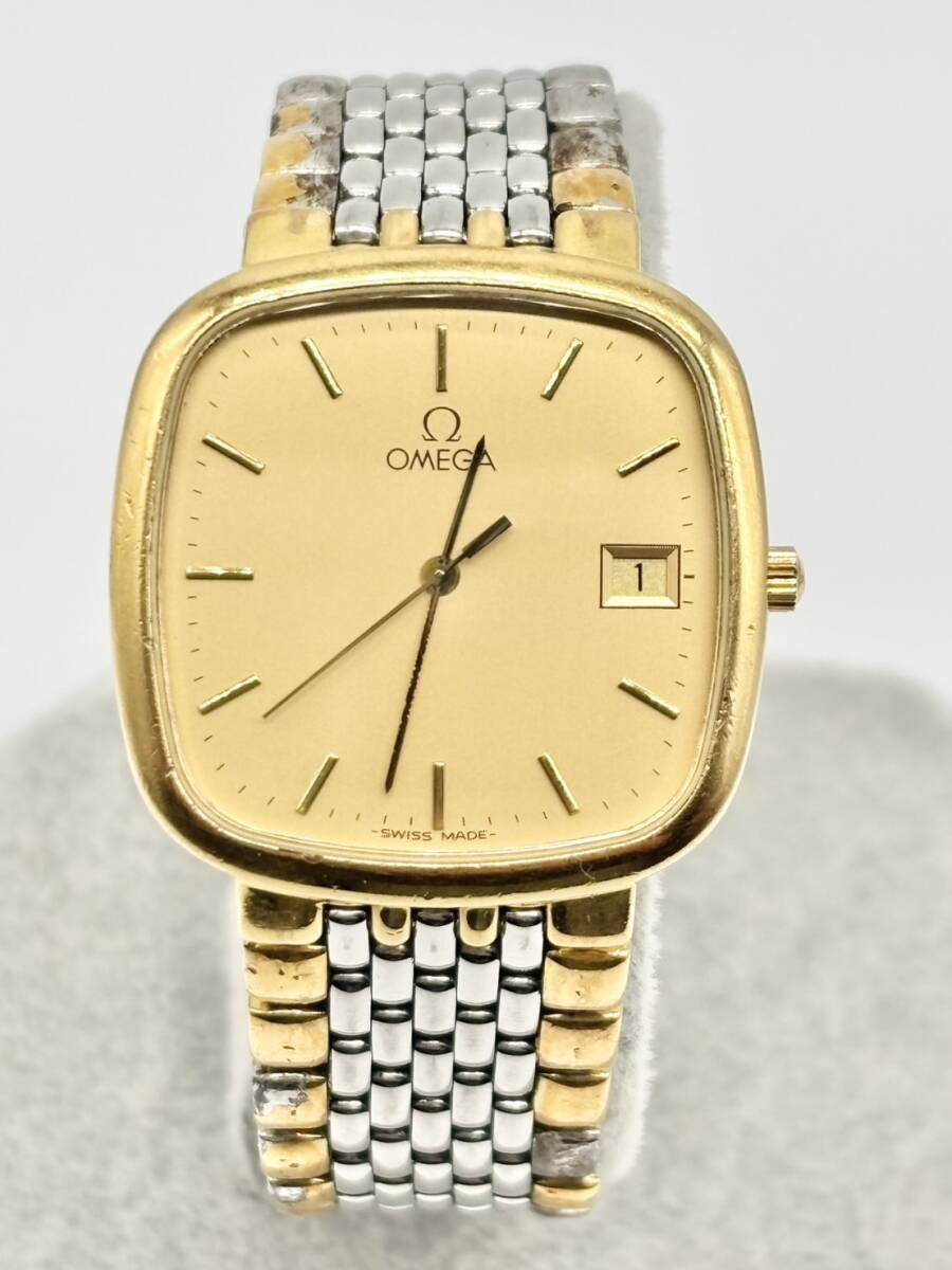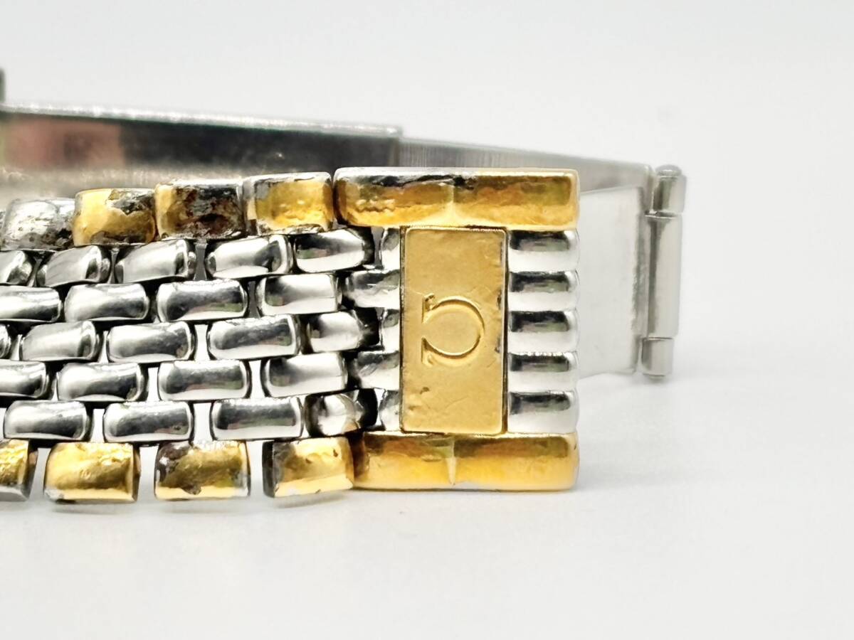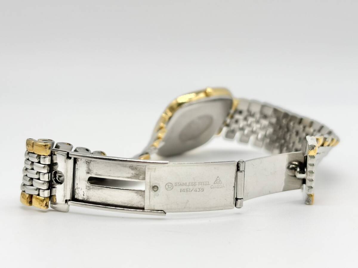 【OMEGA】オメガ デビル 純正ベルト メンズ スクエア クォーツ コンビ 1451/439 腕回り18㎝ De Ville ゴールド文字盤 SS デイト