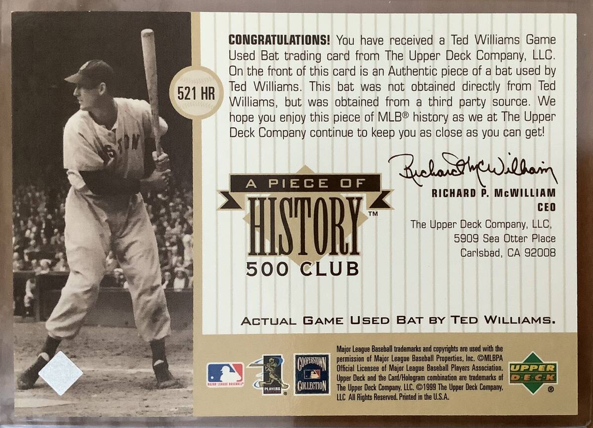 Upper Deck 1999 A Piece of History 500 CLUB TED WILLIAMS Game Used Bat Card テッド・ウィリアムス バット・カード 激レア! 超貴重!