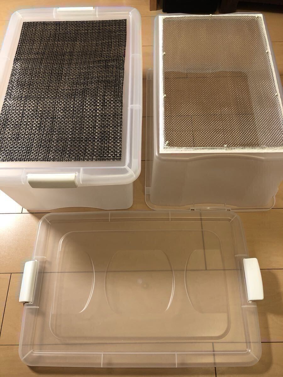 衣装ケースを2段重ねて、上段底をステンレスメッシュに施工(耐候性シーラント接合)、ステンレスにより錆びることもなく清潔で適度なメッシュを採用することができました