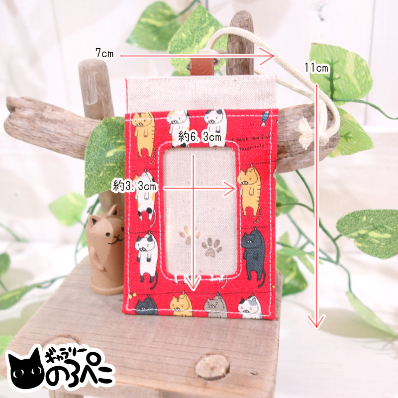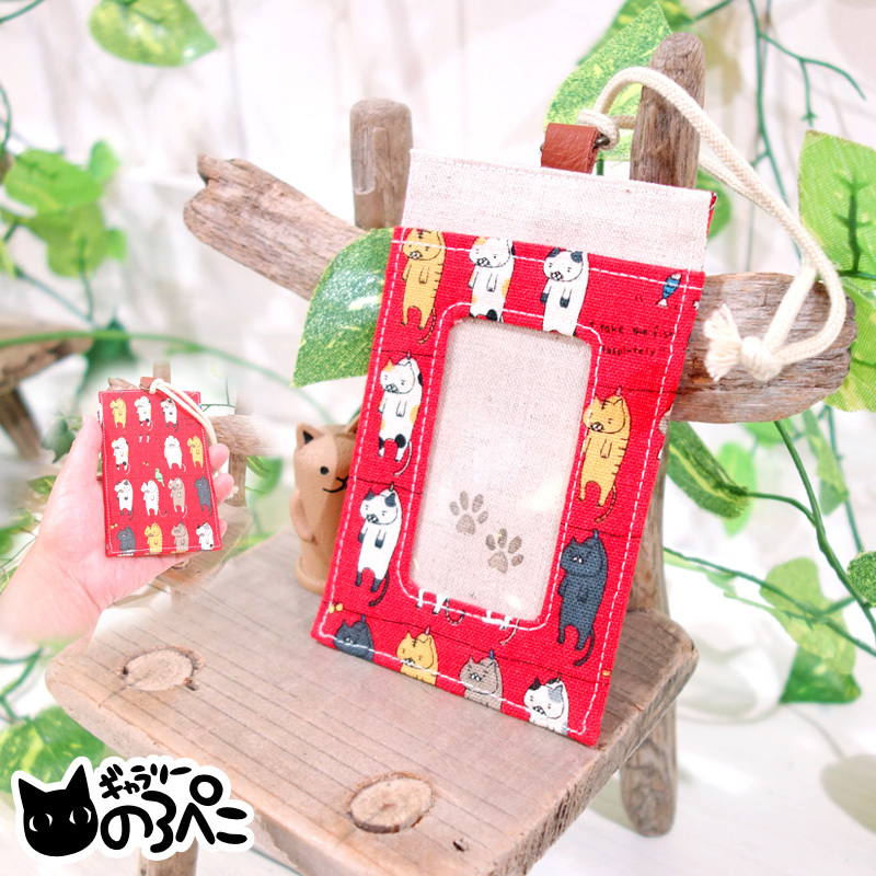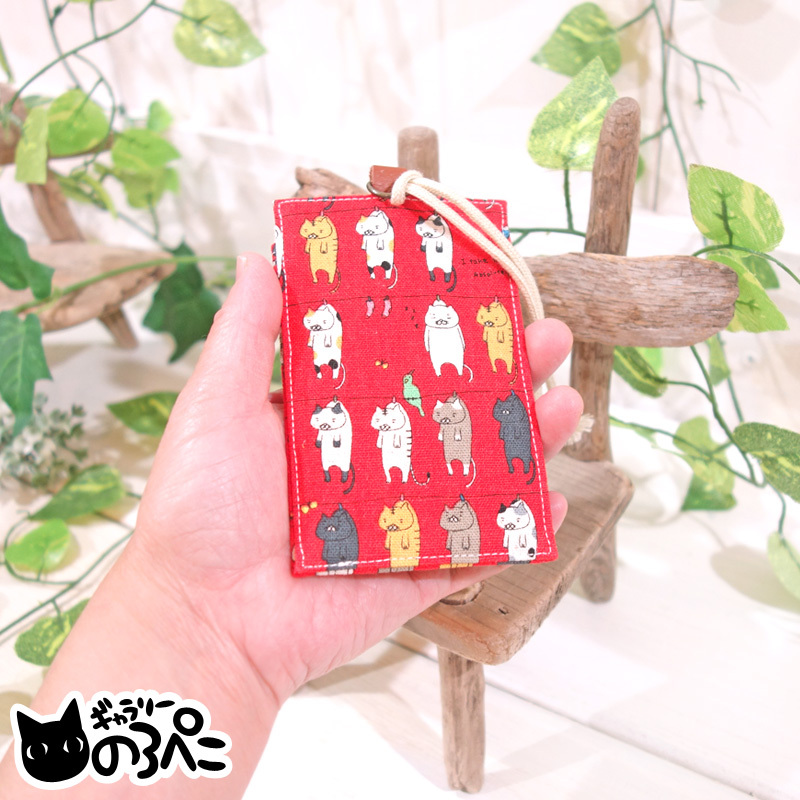 洗濯猫ちゃんのパスケース(猫柄生地と生成りコットンリネンのシンプルパスケース・赤) bc630-372