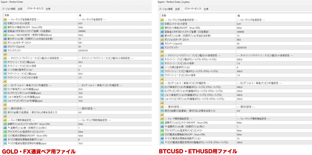 ![]() GOLD・FX通貨ペア用とBTCUSD・ETHUSD用と2種類のファイルに分けており、 さらにBTCUSD・ETHUSDで桁数が違いますので、それぞれのセットファイルもご用意しました。 暗号資産用ファイルのデフォルトはBTCUSD用の設定になっています。 ナンピン幅やロット倍率、利確幅の設定はもちろん、最大ポジション数や複利ロット機能も標準搭載。 それ以外にも独自のトレード補助機能を搭載しました。 ■追撃ポジションエントリー 追撃ポジションとは、勝手にこちらで名前をつけてしまったのですが いわゆる初期ポジションの次にナンピンエントリーするポジションのロット数を 初期ポジションと同一ロットにすることができるポジションのことです。 例えば、初期ロット0.01、ロット倍率2倍でエントリーする場合 0.01→0.02→0.04→0.08→0.16・・・ このようにロットが増えていきますが、追撃ポジション1で使うとこうなります。 0.01→0.01→0.02→0.04→0.08→0.16・・・ 追撃ポジション2にするとこんな感じです。 0.01→0.01→0.01→0.02→0.04→0.08→0.16・・・ この赤字のポジションが追撃ポジションということになります。 ■プライスアクション型変則ナンピン 設定したナンピン幅に加えて、値動き(プライスアクション)に応じて ナンピンエントリーの自動制御を行い、値動きが落ち着いてきた場面で 次のナンピンエントリーが入るようにできる機能です。 重要指標時など急激な暴騰暴落やフラッシュクラッシュ時に 無駄なナンピンをしないので、一瞬でロスカットされる事態を防ぐことができます。 ■リスク軽減処理機能 予め設定しているポジション数に到達した場合に設定されている利確幅を再計算し直して、 利確レートを従来の利確幅よりも現在レートに対して近くすることにより 早期に決済させることができる機能です。 ナンピンポジションが溜まってきた時にいち早く撤退し、 長期戦による含み損が膨れ上がるリスクを軽減させるのに役立ちます。 ■Exness:XAUUSD設定(GOLD・FX通貨ペア用ファイルのみの機能) 証券会社のExnessのXAUUSDはレートが小数点第三位まであるため、 1pipsの桁が他社と異なり、設定の際に桁を増やして使用しなければいけませんが それを内部処理で自動的に最適化される機能を追加しました。 そのため、もしExnessのXAUUSDでトレードをする場合は この設定をtrueにして頂くだけで、そのまま使用できる便利な機能です。  |