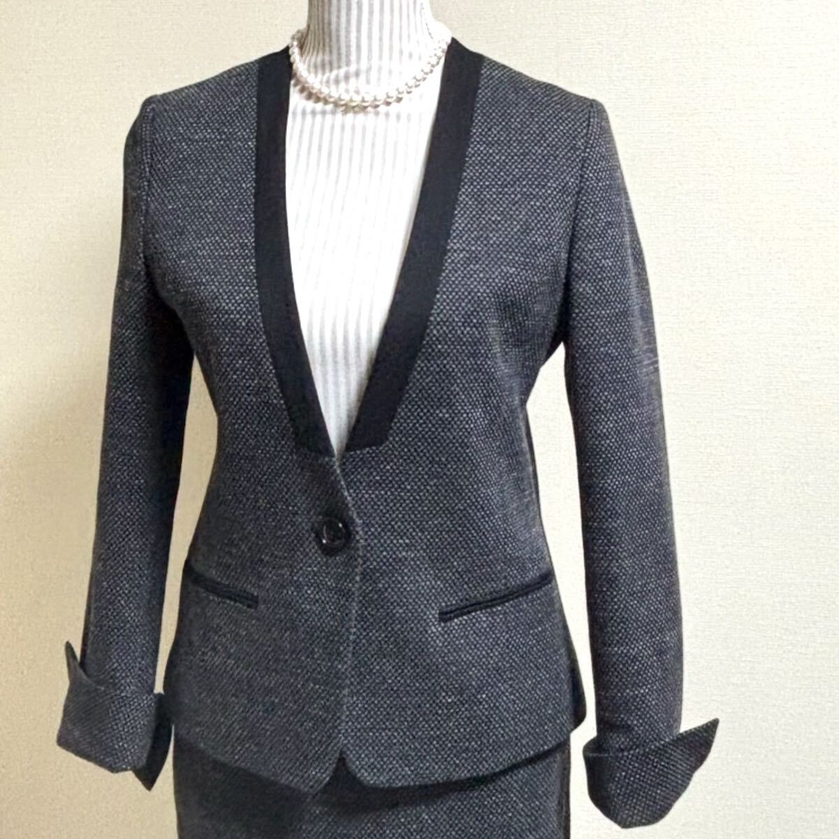 スタイリッシュでシルエットの綺麗なツイードスーツ ジャケット&スカート セットアップスーツです