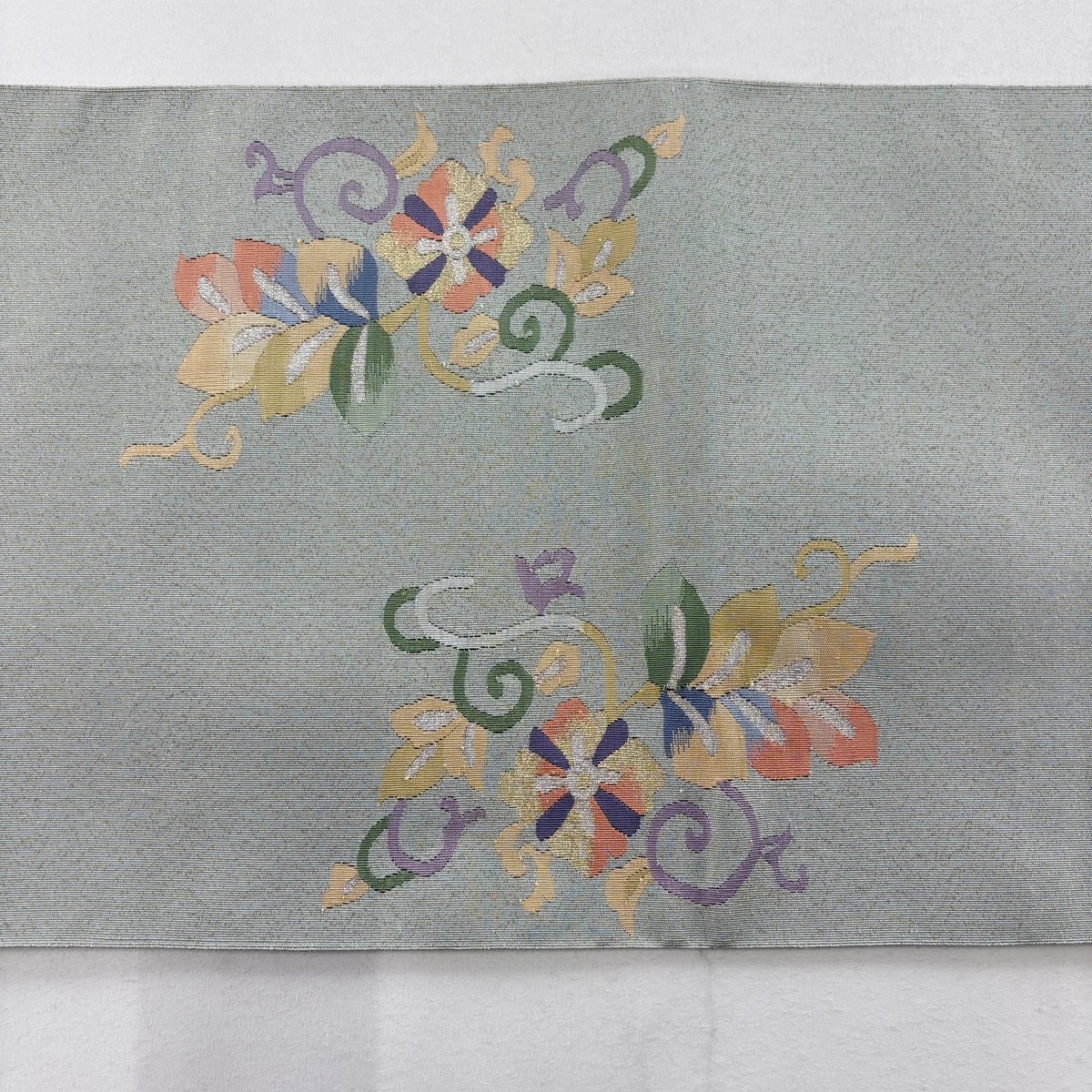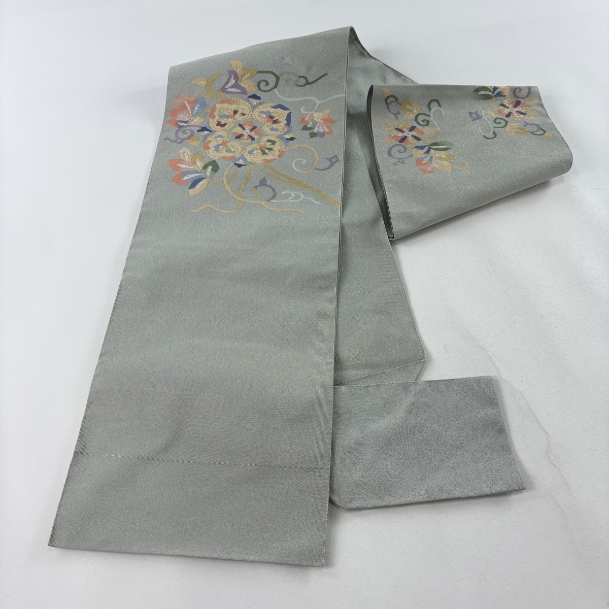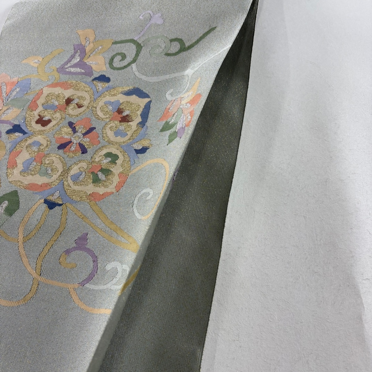 | 名古屋帯 美品 秀品 八寸名古屋帯 松葉仕立て トンネル仕立て 花唐草 華文 金銀糸 灰緑 正絹 【中古】 |