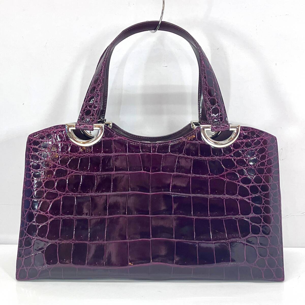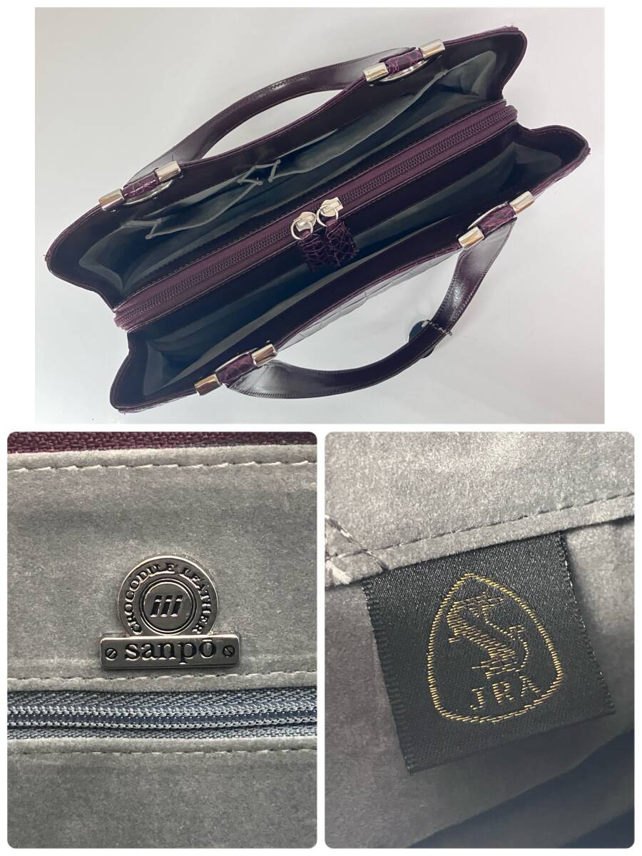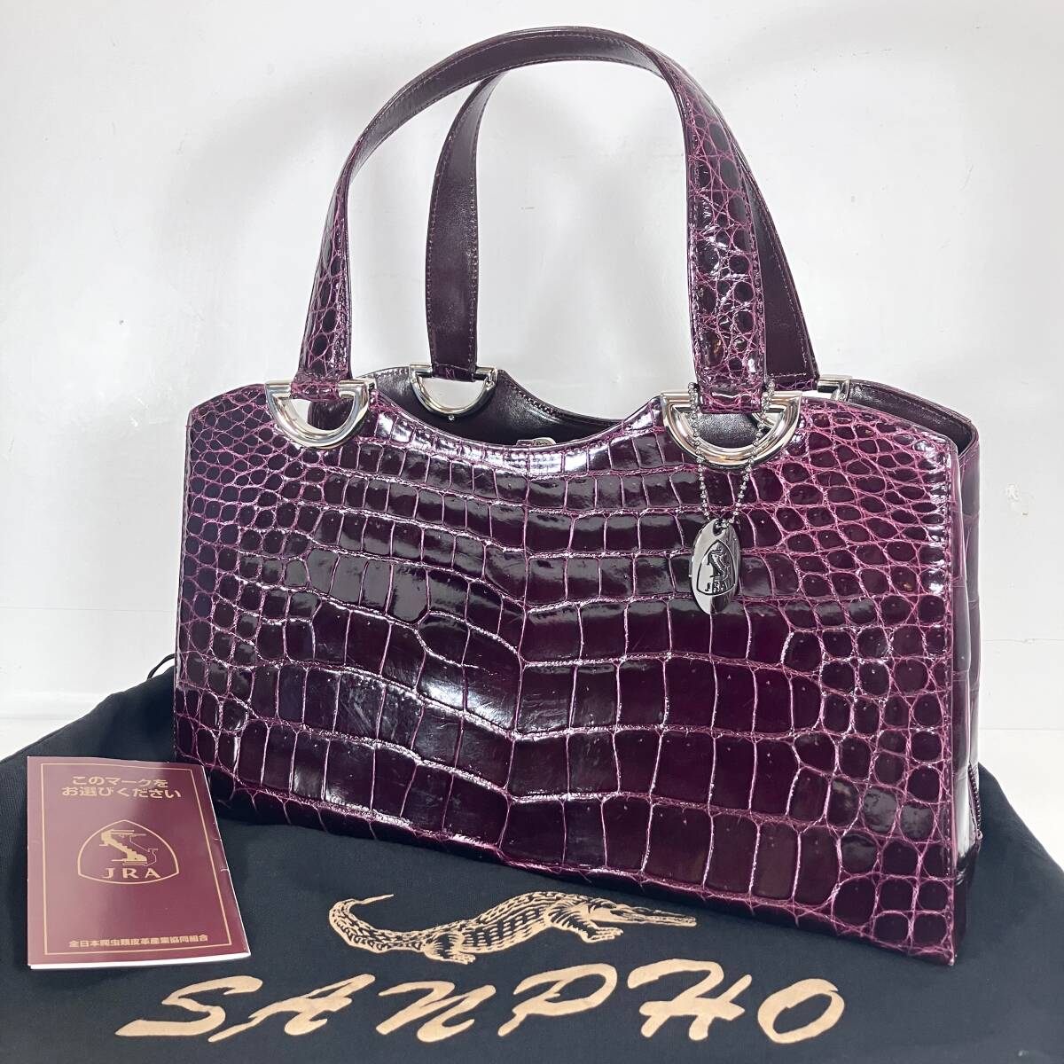 志[美品]JRAタグ付 sanpo/三宝 シャイニングクロコダイル ハンドバッグ ワニ革 紫 パープル系 袋付 エキゾチック レザー サンポー(I)0920D