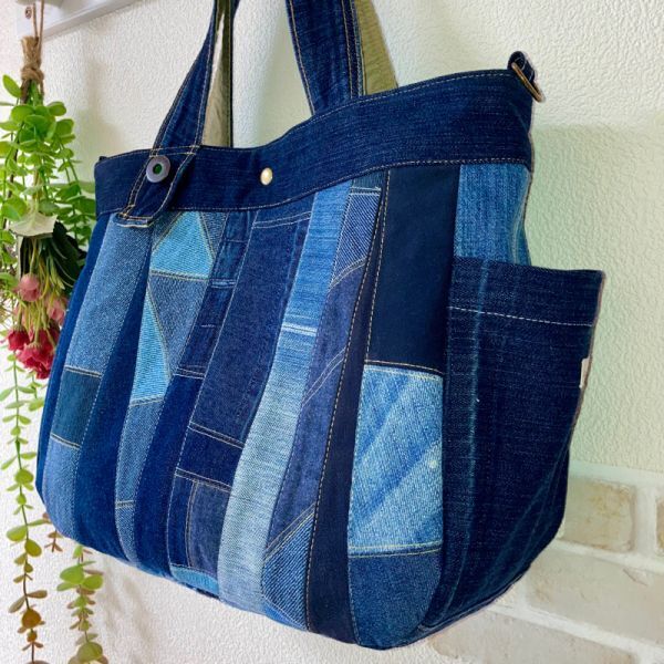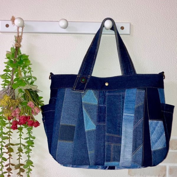 《 れい¥れいのハンドメイド生活 》 ◇ご覧いただきありがとうございます◇ ☆お出掛けトート☆3WAY☆ショルダー紐付き ☆リメイクデニム☆パッチワーク☆ 《 商品説明・サイズ 》 リメイクデニムのパッチワークの 3wayお出掛けトートバッグです 内布は紺色水玉柄生地使用 内マチポケットにはペットボトルも入ります 横上部41㎝ たて中央29㎝ マチ底12㎝ 持ち手39㎝ 外ポケット3個 内ポケット5個 マグネット釦付き バッグ本体の重さ 約460g(ショルダー紐含む) 《 素材 》 ☆パッチワーク地 綿100%(USEDデニム)) ☆内布 綿100% ★デニム生地はUSEDの為ダメージがあります 《 お支払い方法 》