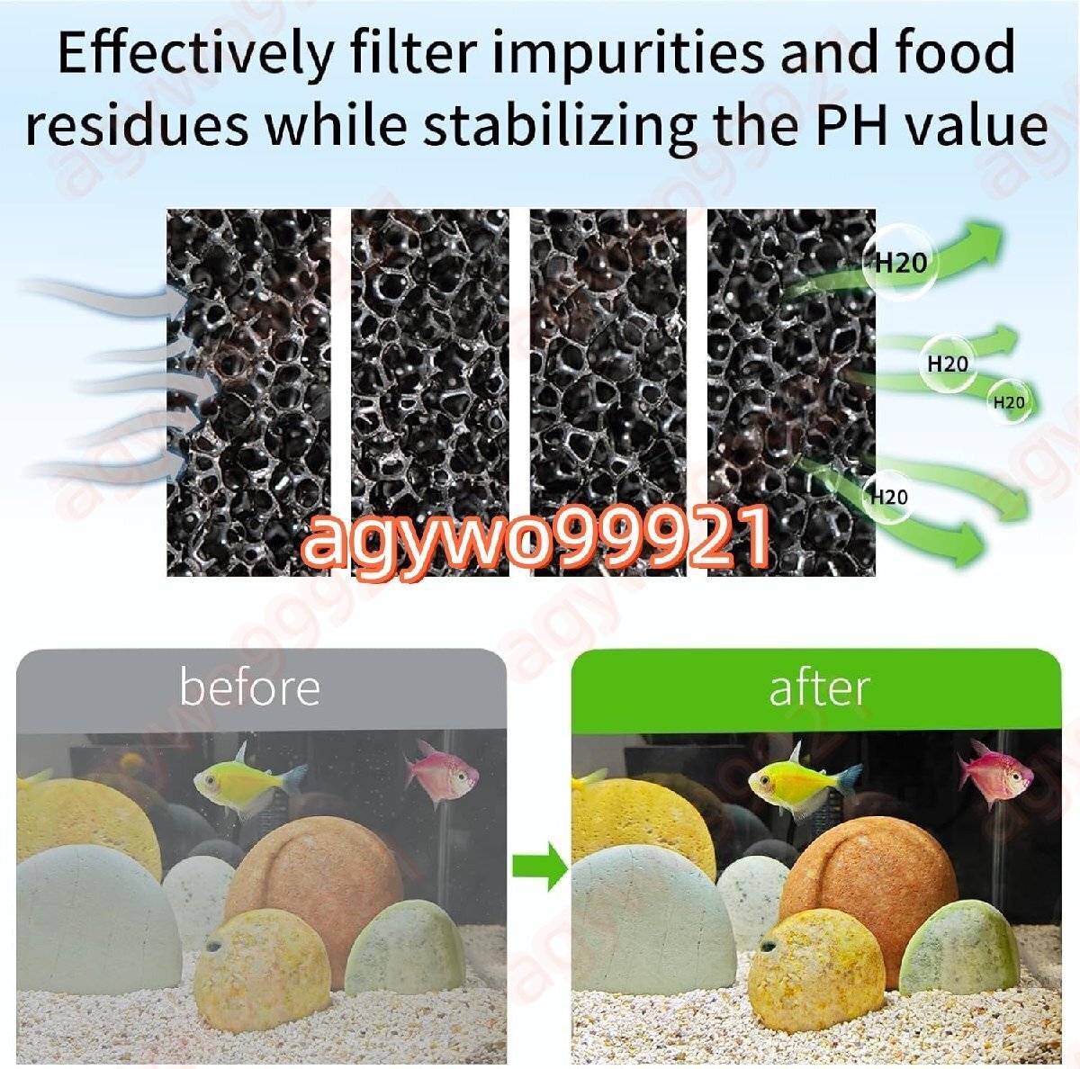 アップグレードされたフィルターカップ:スポンジ、フィルターボール、活性炭ボールを備えた新しいアップグレードされたフィルターカップは、水中の不純物を効果的にろ過し、きれいな水を水槽に戻して、水のろ過と循環を実現します。通常のスポンジフィルターカップやフィルターバッグよりも清潔で、水中の不純物の99%を効果的にろ過します。フィルター素材は繰り返し洗って再利用できるため、魚の健康と活力を保ちます。