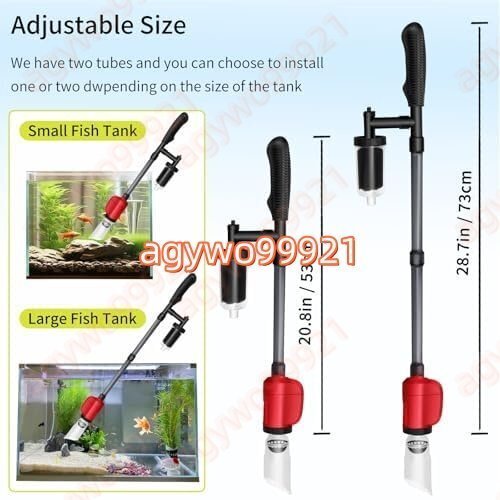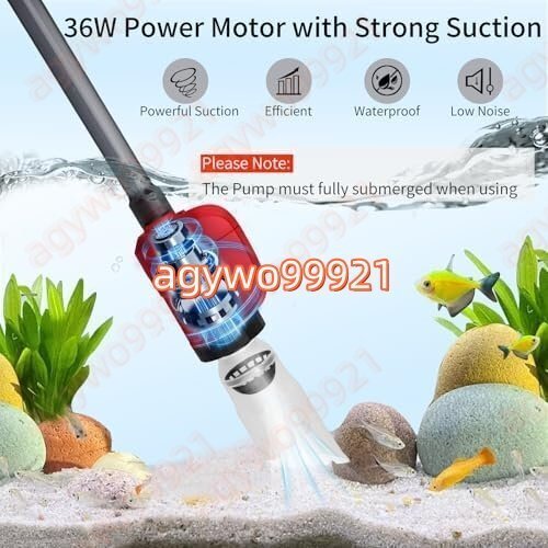 静かでパワフルな吸引力:当社の36W水槽用砂利クリーナーは強力な吸引力を備え、砂や魚のフンを効果的に除去し、水槽を清潔に保ちます。最大流量は毎時581ガロン(約240リットル)で、水槽や魚の水槽の水替えに便利です。静音設計であることも注目すべき点です。静かな環境を作り出すのに役立ちます。