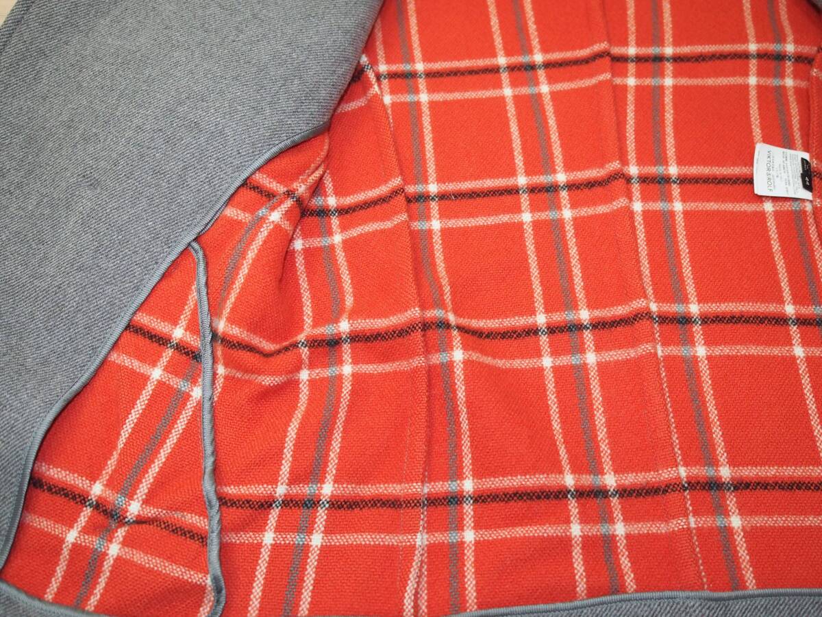 裏がオレンジのチェック地になったダブルフェイスのウール素材を用いたピーコートです。