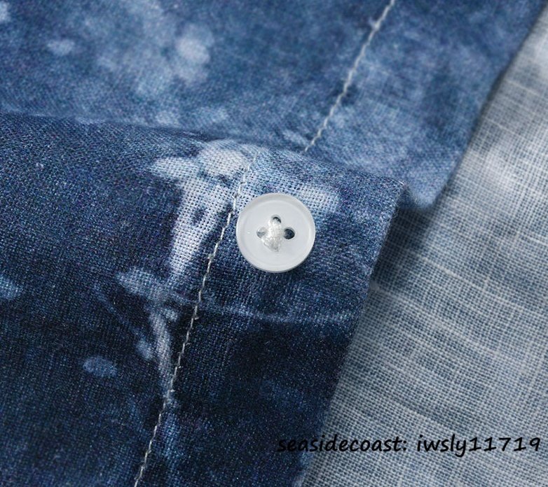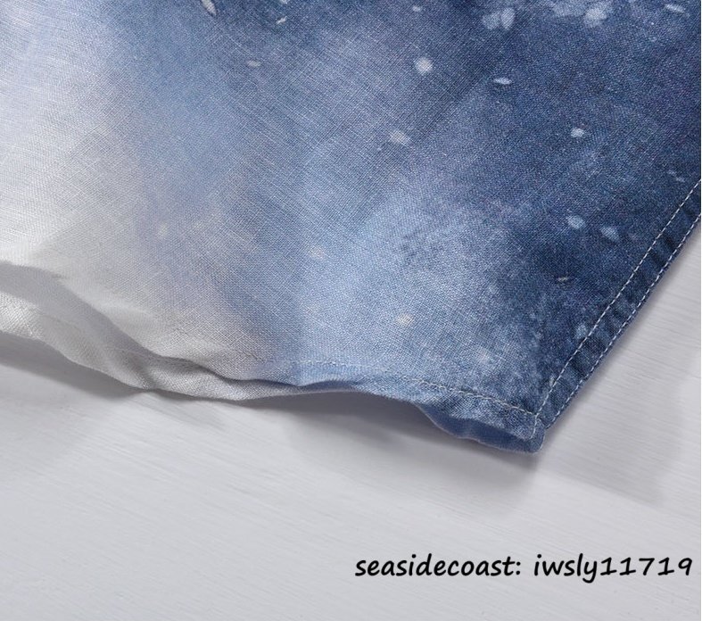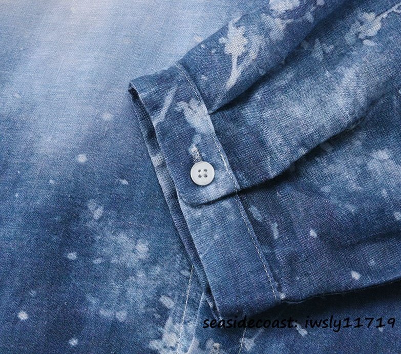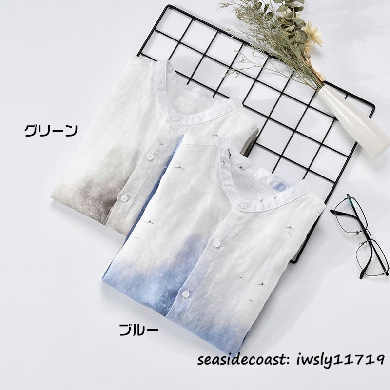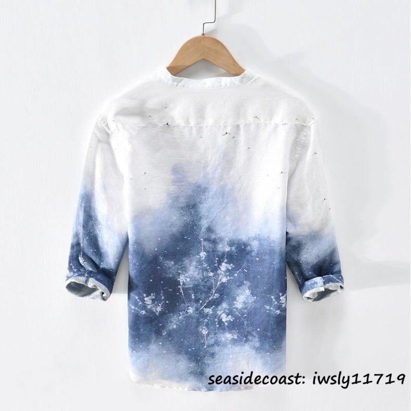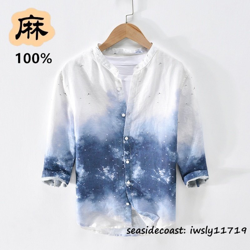 新品★七分袖シャツ 麻100% メンズ リネンシャツ グラデーション 通気 清涼感 春夏 シャツ サマーシャツ カジュアル 薄手 ブルー M