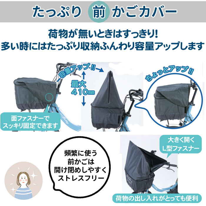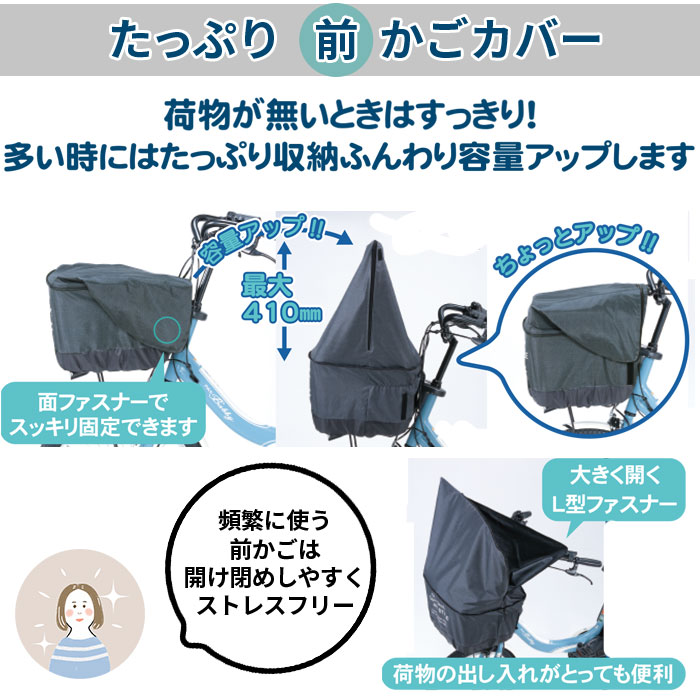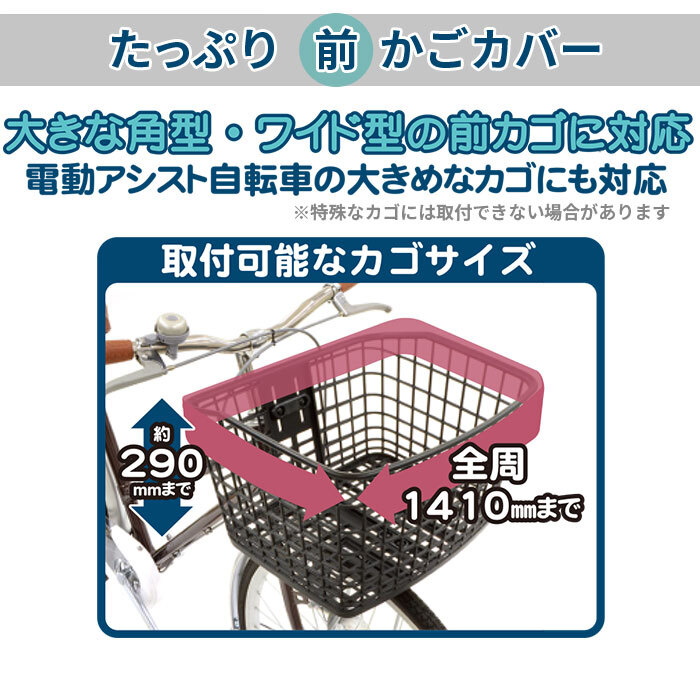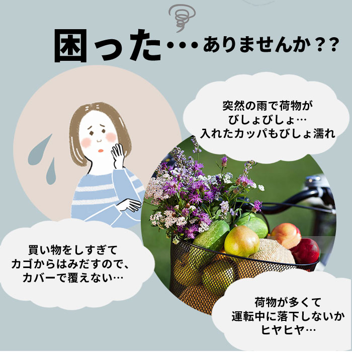 | 注意点 | ※大きな角型・ワイド型等、電動アシスト自転車の大きめなカゴにも対応。(特殊なカゴには取り付けできない場合があります。) ※汚れは水またはぬるま湯で洗い流して下さい。 ※もみ洗い等は避けて下さい。 ※洗剤のご使用はおやめ下さい。 ※鋭利なもので突いたり、引っかいたりしないでください。 ※本製品は完全防水ではありません。 ※サイズより大きなカゴに無理矢理かぶせないで下さい。破れる可能性があります。 ※ひったくり防止や抑止には効果がありますが、安全ではありませんので、貴重品などの管理はご自身にて行って下さい。 ※自然光などにより、通常のご使用でも若干の変退色がおこります。 ※カメラやモニターの性質により、画像と実物の色の違いがある場合がございますのでご理解願います。 |