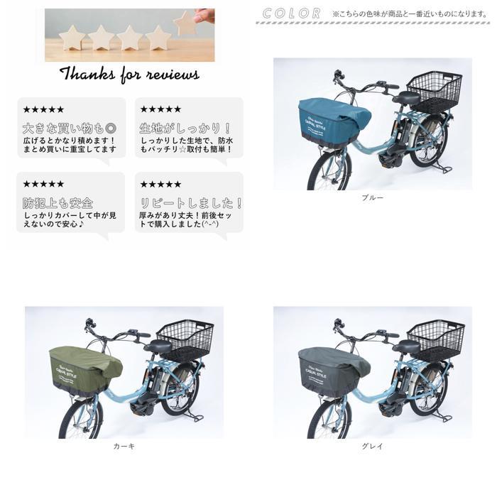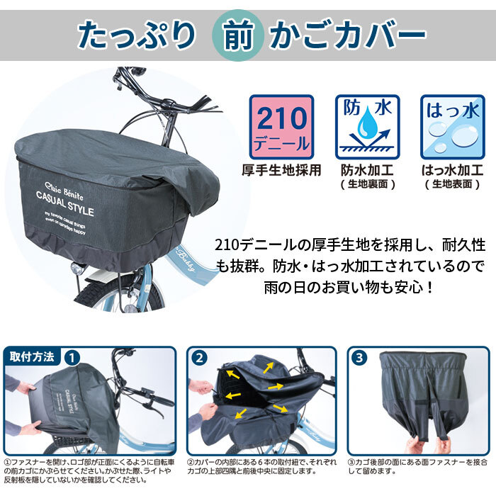 | 使用方法 | [取付け方法] 1.ファスナーを開け、ロゴ部が正面にくるように自転車の前カゴにかぶらせてください。かぶせた際、ライトや反射板を隠していないかを確認してください。 2.カバーの内部にある6本の取り付け紐で、それぞれカゴの上部四隅と前後中央に固定します。 3.カゴ後部の面にある面ファスナーを接合して留めます。 |