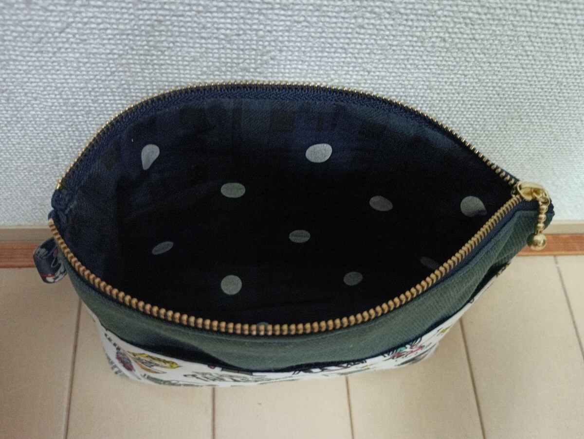 ハンドメイド 青緑色&スヌーピー柄のポーチです。前にポケット付いてます。中は紺色&濃い緑色のチェック柄に白色ラメドット柄の生地です。20cmのファスナーを使用しています。通帳入れにもお使い頂けます。