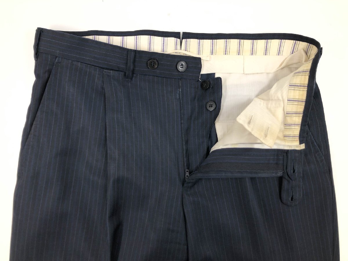 ・スラックス・・・ウエスト実寸約84センチ(2センチ出し、4センチ詰め可能)、股上約27センチ、渡り幅約35センチ、股下約73センチ、総丈約100センチ、裾幅約21センチ、ダブル仕上げ(ダブル幅約4.5センチ、最大でプラス10センチ長くできます)