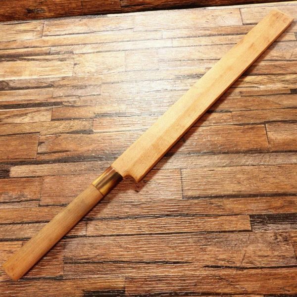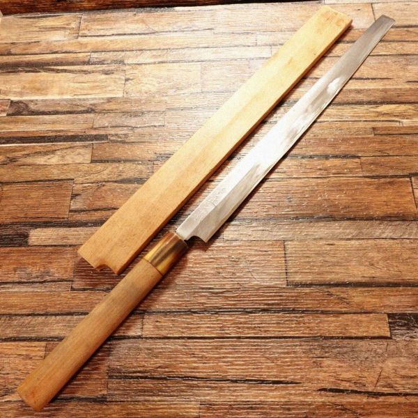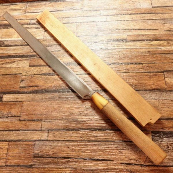 木鞘がついているお品です。先の方が少し細くなっている感じがあります。ご使用に差し支えないかと思いますがお値段には反映しております。研ぎも入っていますので、到着後すぐにお使いいただけます。開梱時にはお気を付けください。もちろん研ぎ代込みのお値段です。