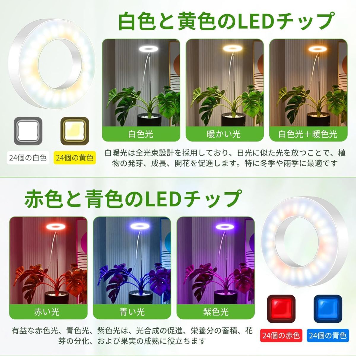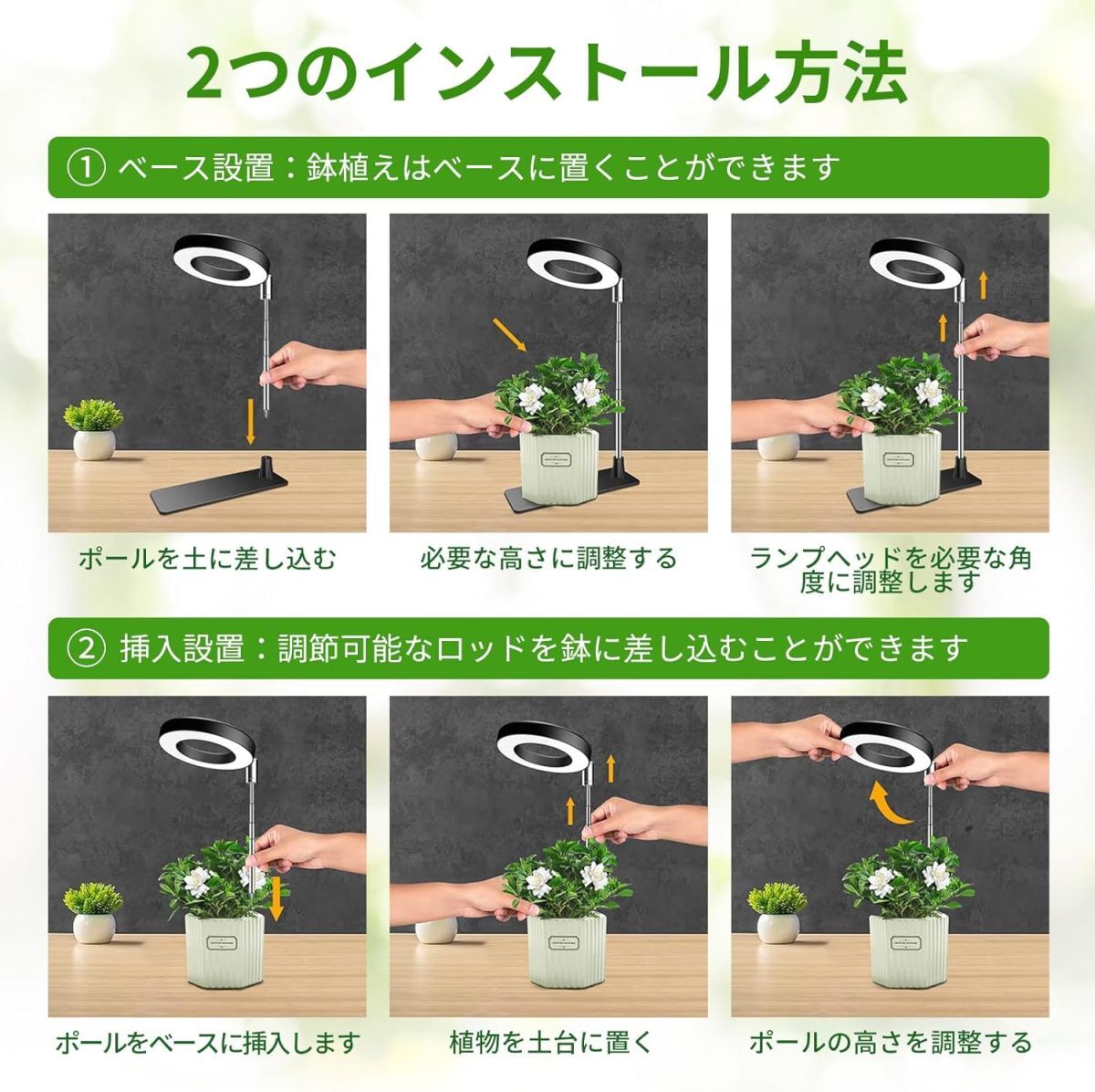 • 【2つの設置方法・ベース設置/挿入設置】2つの設置方法があります:1.取り外し可能な独立したベース設計、安定性を確保するために植木鉢をベースに置きます。2.調節可能なロッドを鉢植えに挿入し、希望の高さを調整するだけです。いつでもどこでも植物に十分な光を提供し、光の保護下で植物が健全に成長できるようにします。