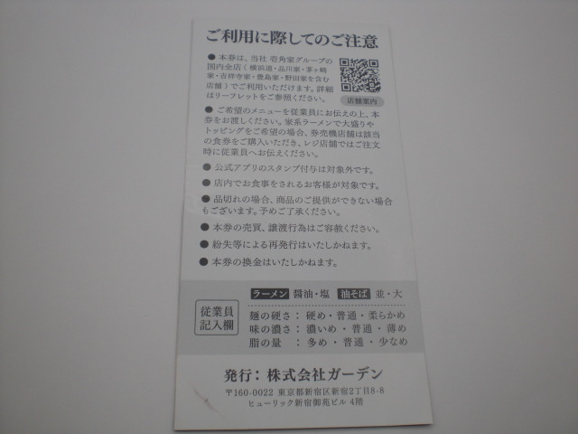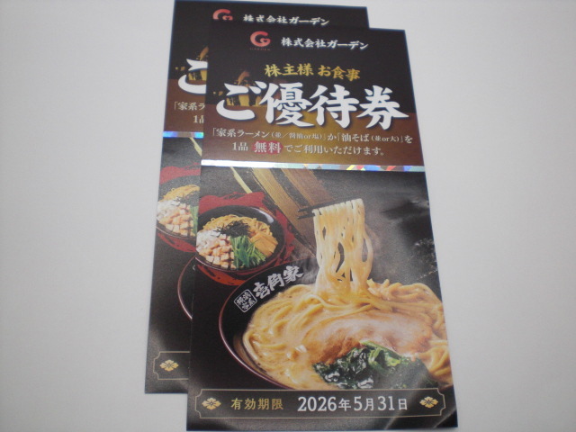 ガーデン株主ご優待券 2枚 壱角家 家系ラーメン・油そば