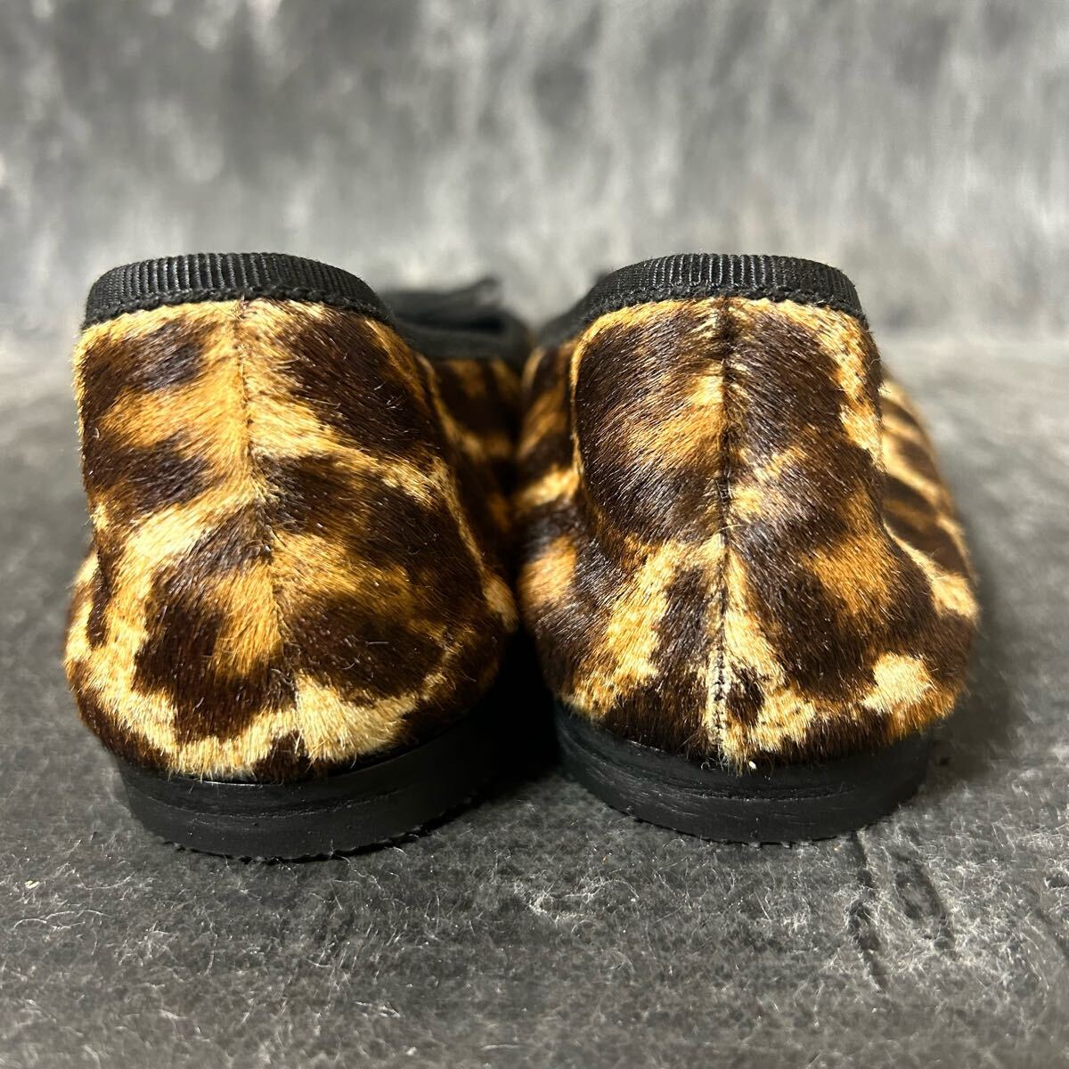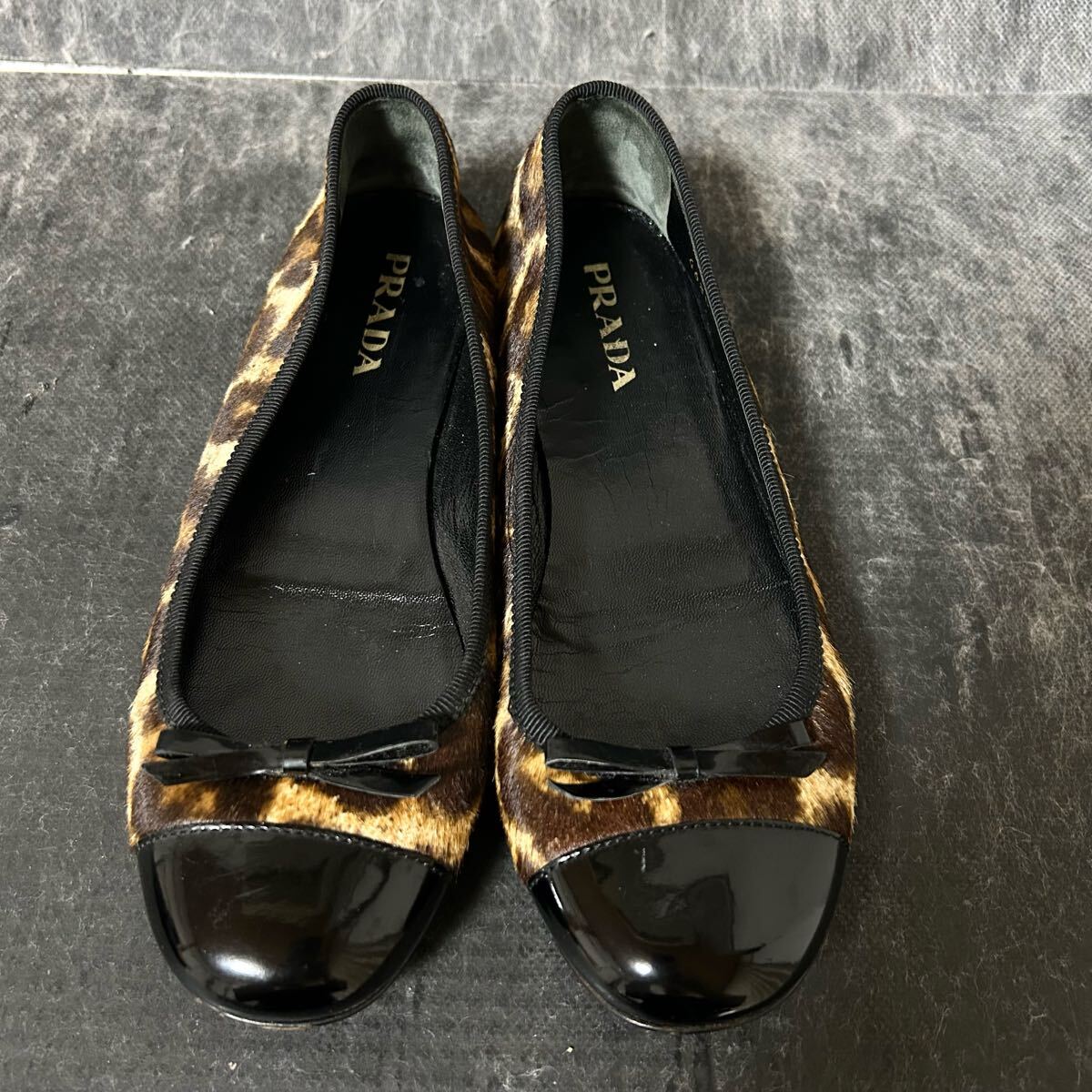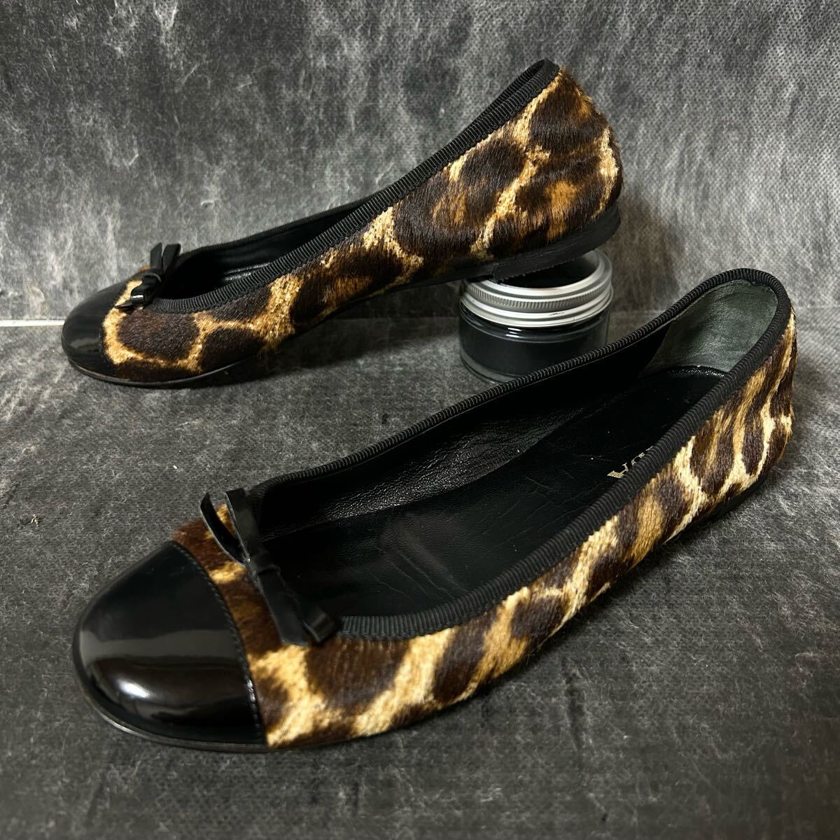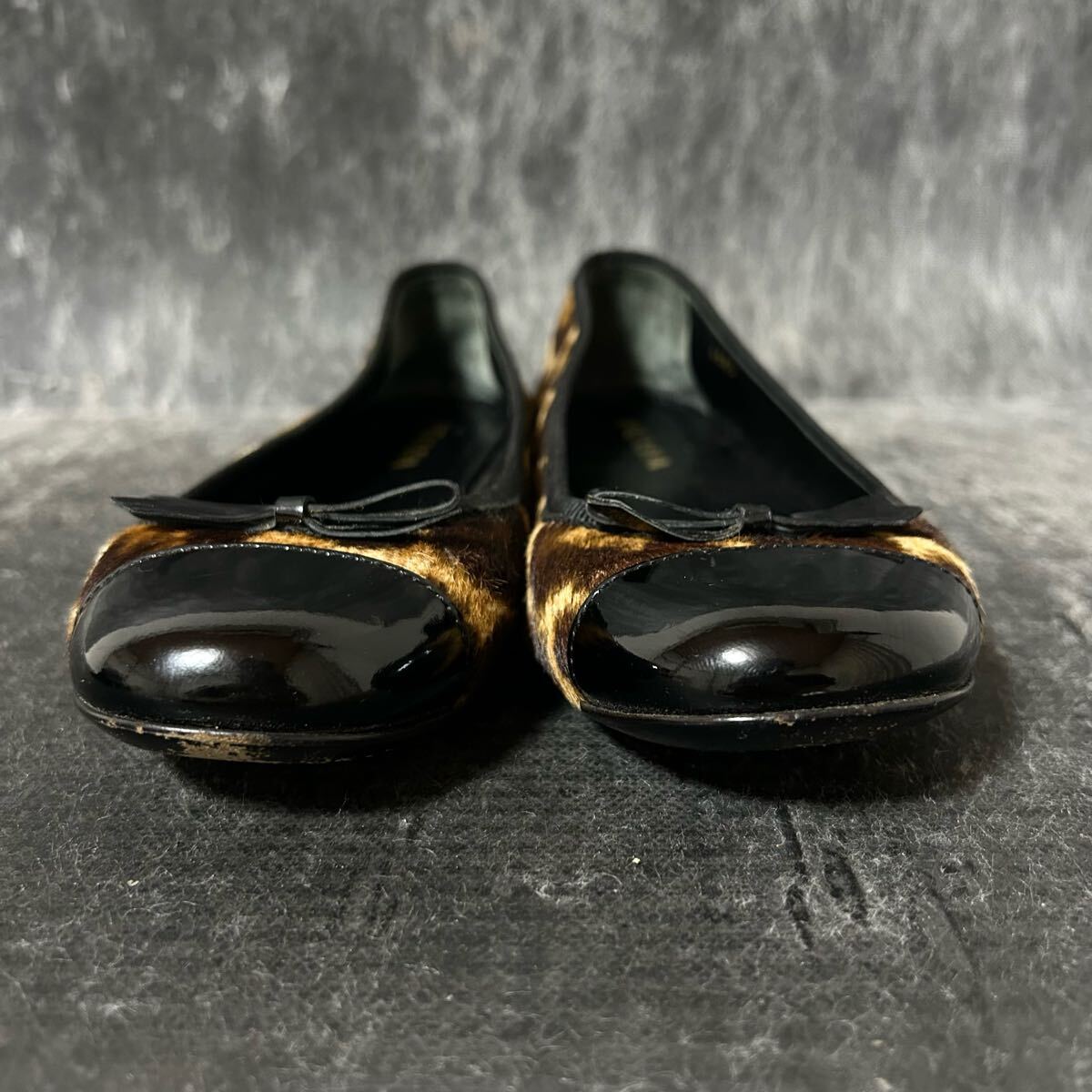 PRADA プラダ フラットシューズ  リボンパンプス エナメル×ハラコ ヒール新品 レオパード 35 22cm相当 ブラウン *Ei