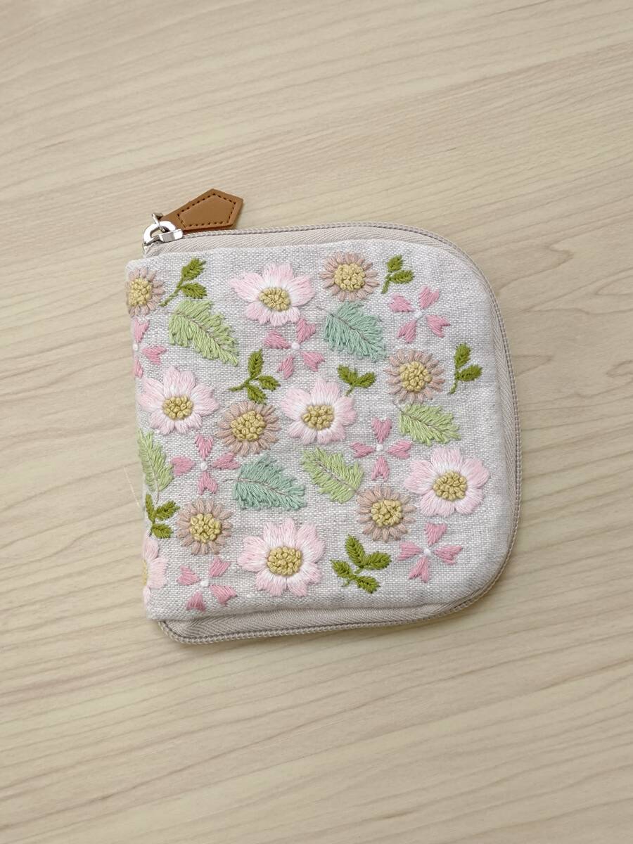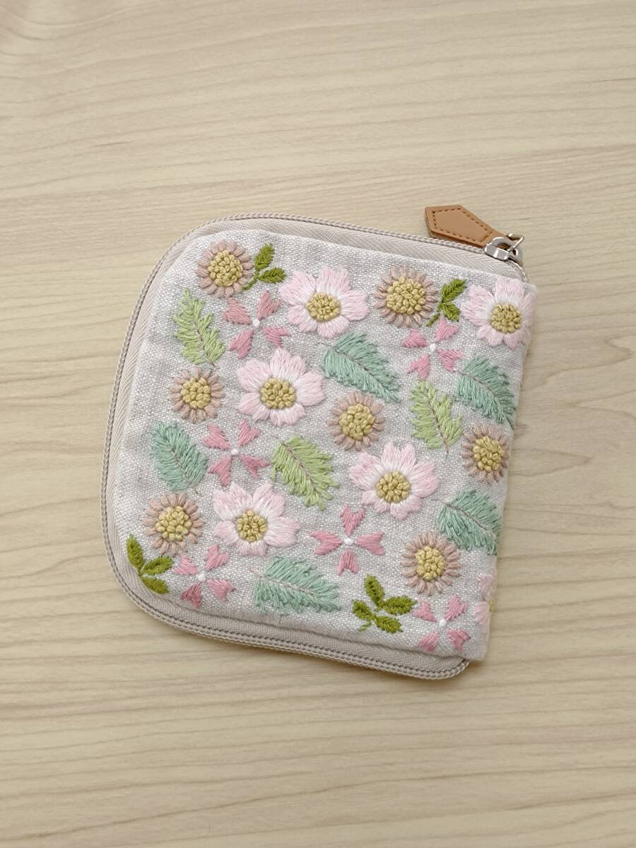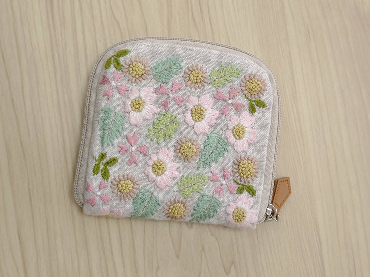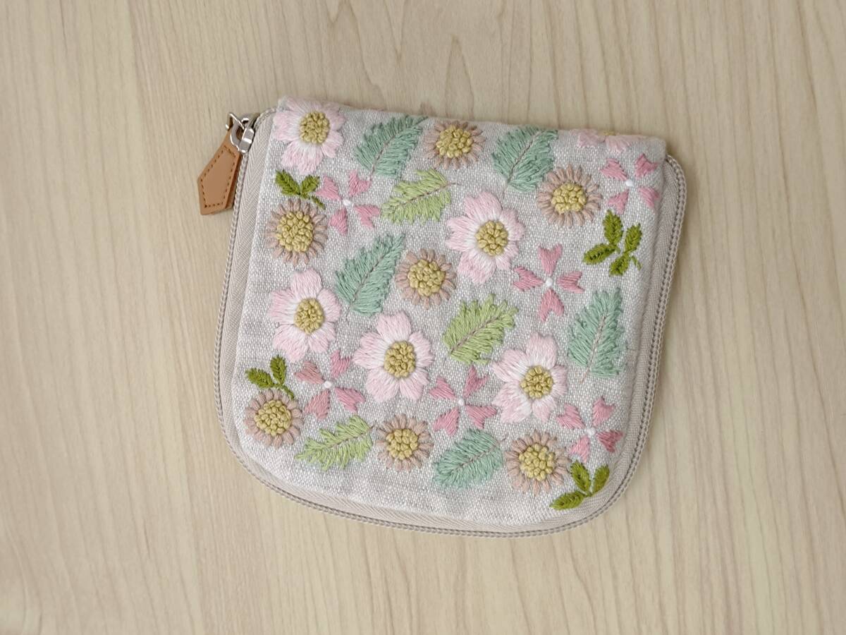 リネン生地に花と葉っぱを刺繍して二つ折り財布に仕上げました。日常使いにぴったりな二つ折り財布です。