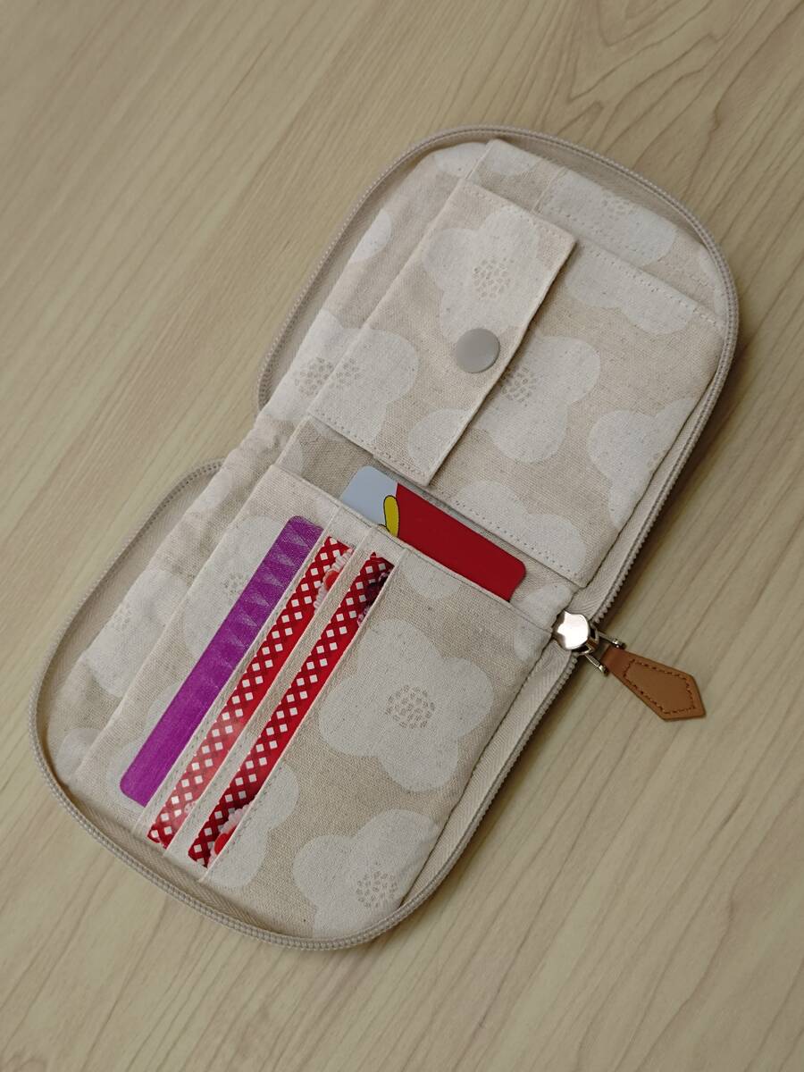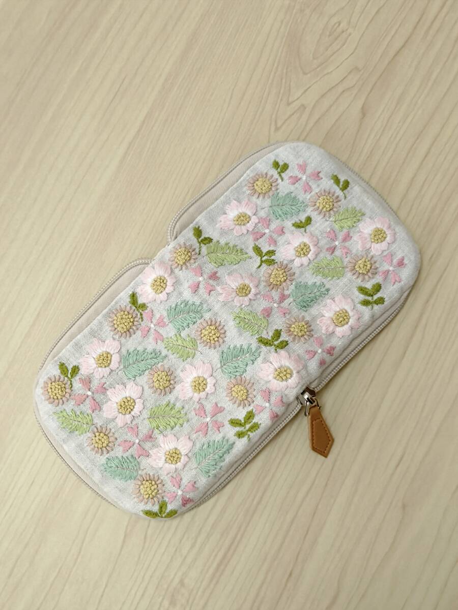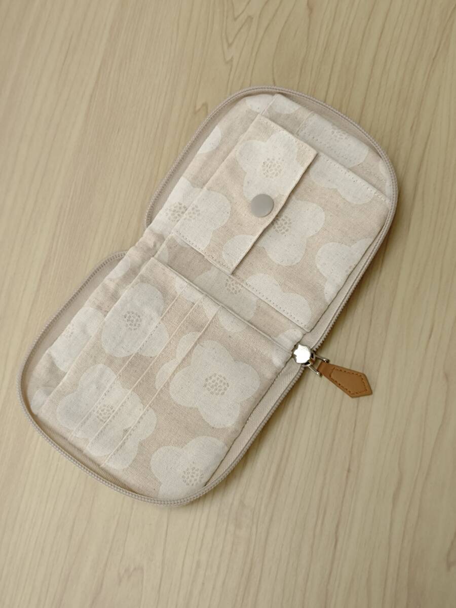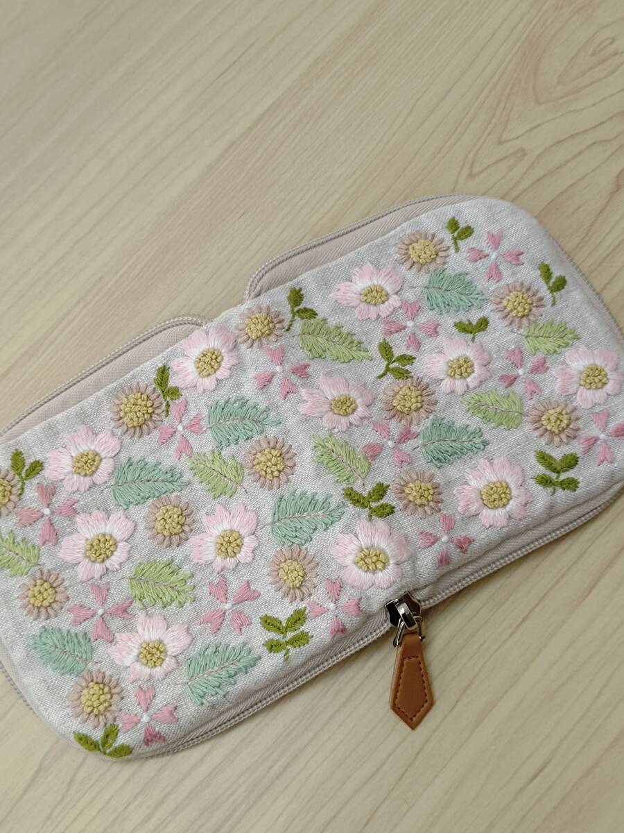 リネン生地に花と葉っぱを刺繍して二つ折り財布に仕上げました。日常使いにぴったりな二つ折り財布です。