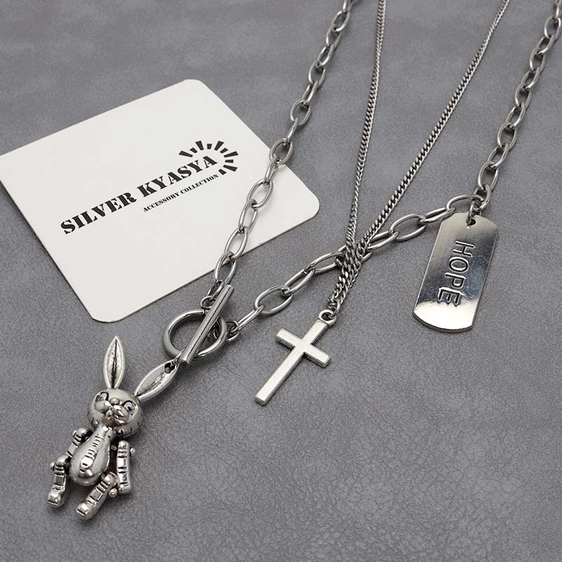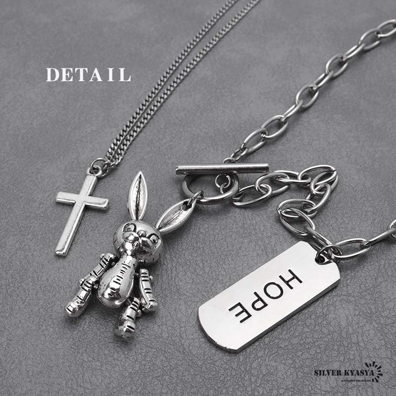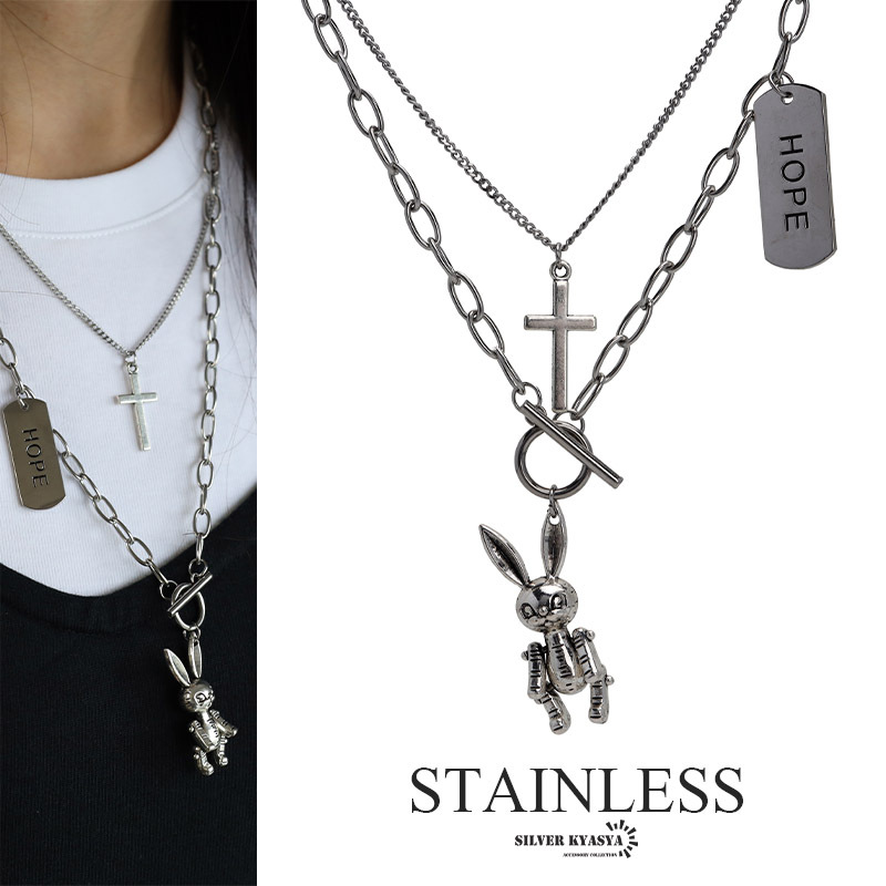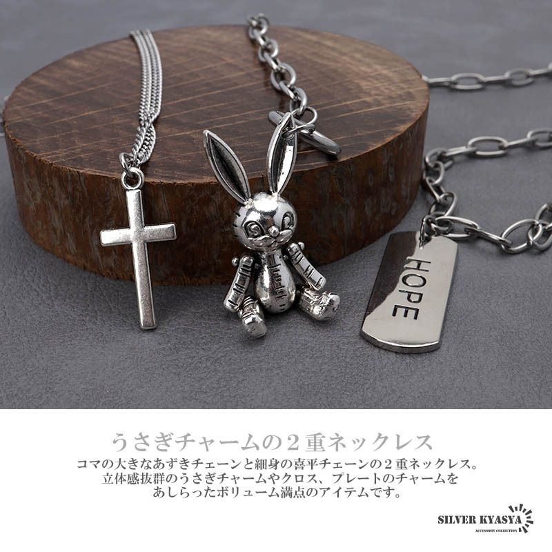重ね付けネックレス ロングネックレス ペンダント 兎 うさぎ クロス プレートネックレス 二重ネックレス マンテルネックレス