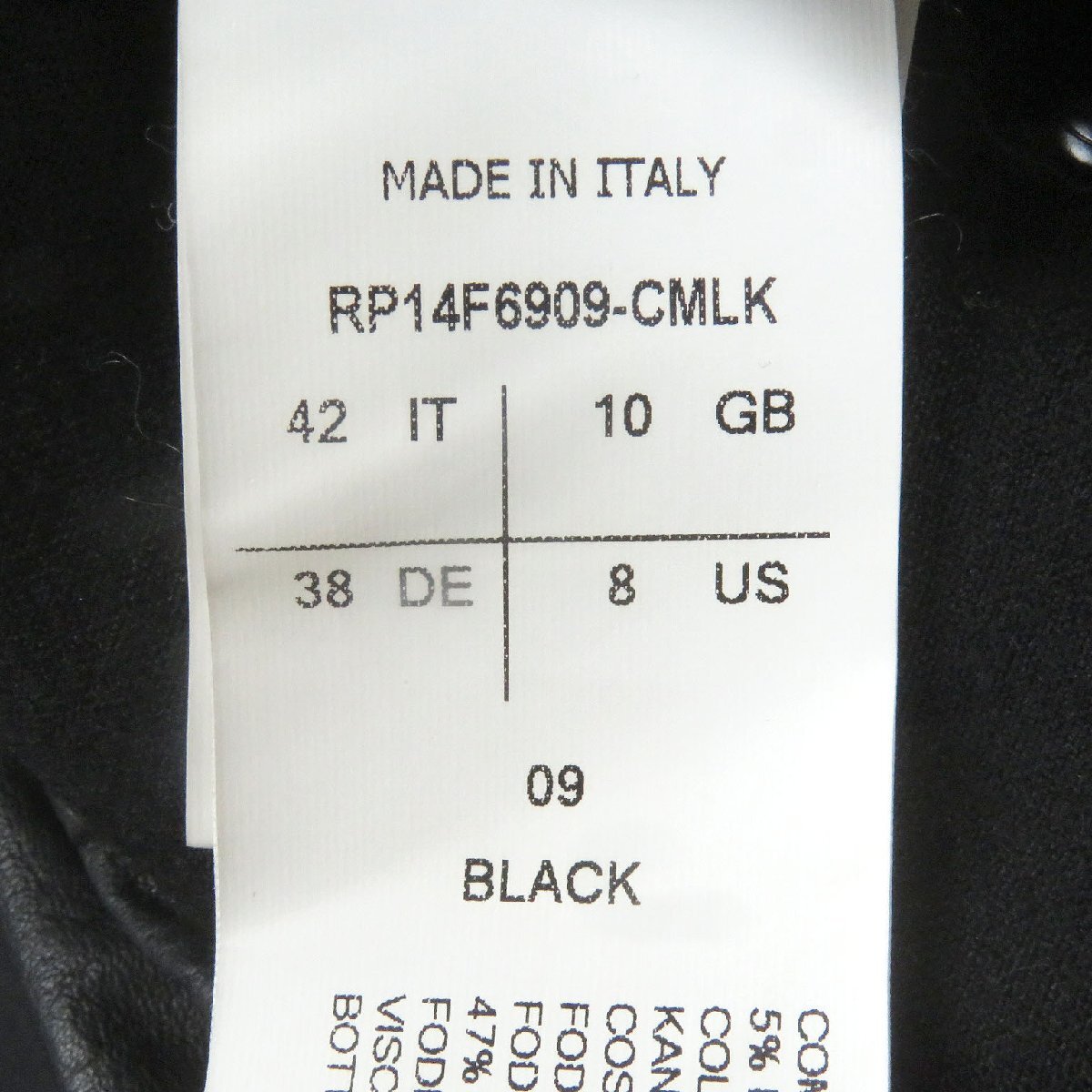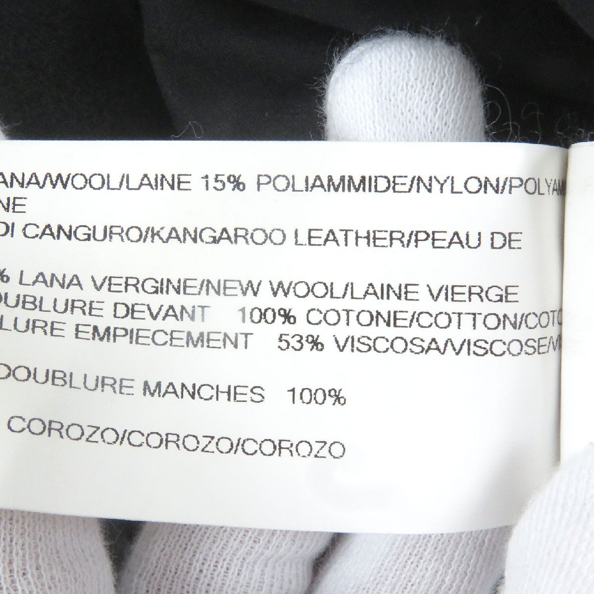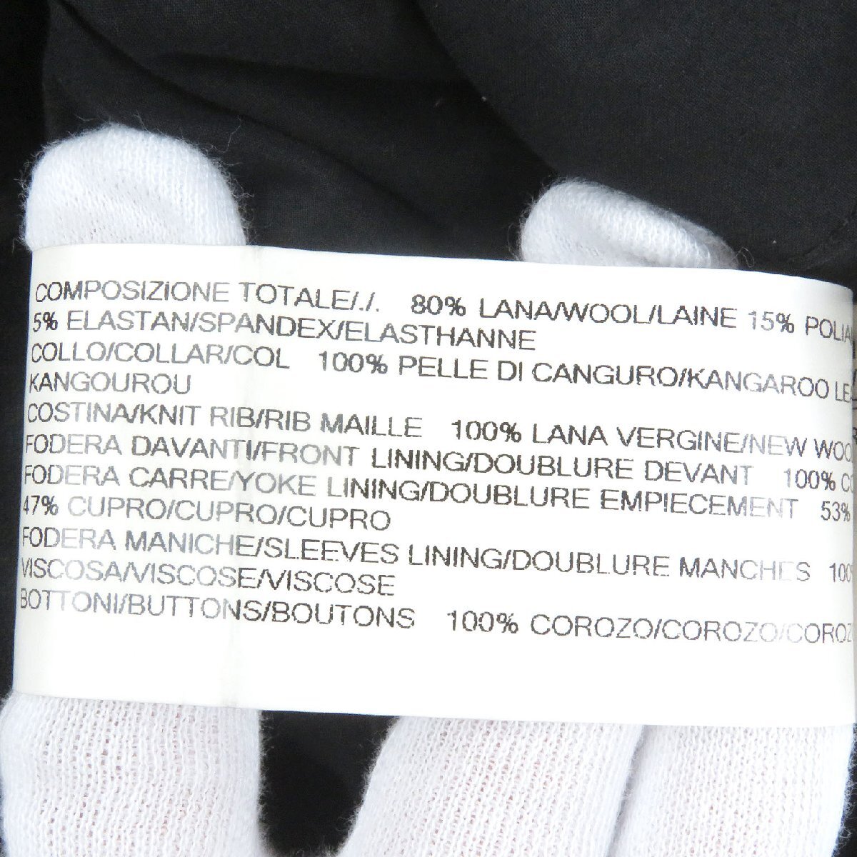 素材 (material) | 本体:ウール80% :ポリアミド15% :エラスタン5% 一部:カンガルーレザー100% 裏地:ビスコース(レーヨン)53% :キュプラ47% | ||||||||||||||||