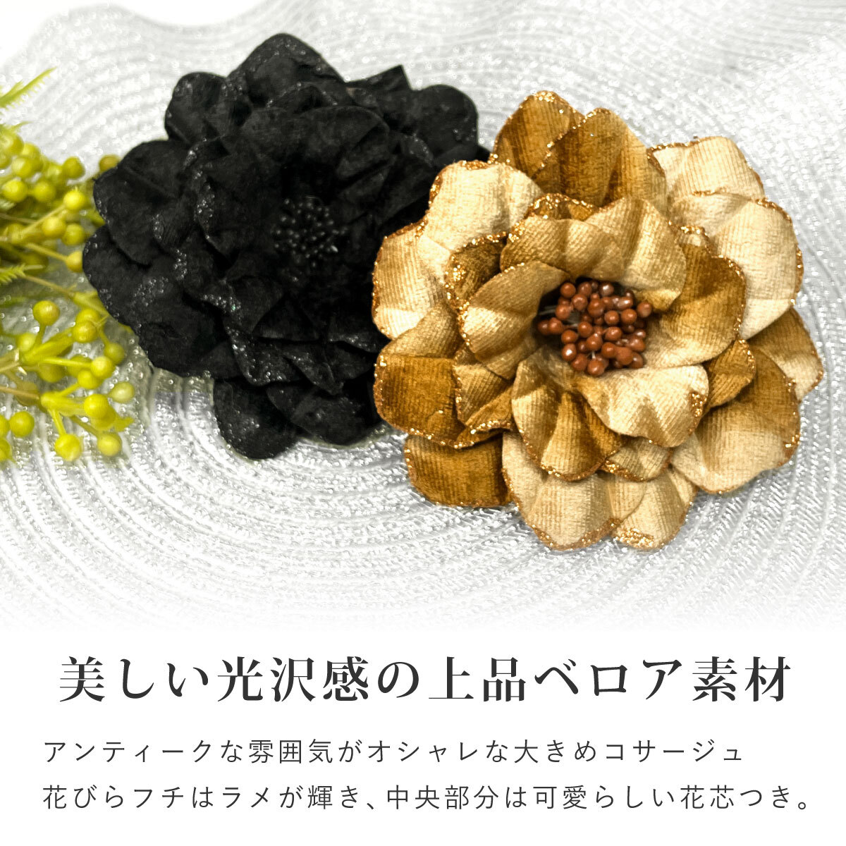 | どこかアンティーク感の漂う上品さがオシャレなコサージュ グラデーションがかったベロア素材の花びらは、フチにさり気なくラメが乗り 中央部分は丸みのある可愛らしい花芯をあしらいました。 美しい光沢感とクラシックな雰囲気が大人っぽく、胸元に華やかさを演出します。 装着部分は安全ピンとくちばし状クリップの便利な2way仕様です。 しっかりと存在感のある約11cmの大きめサイズです。 卒業式・入学式のスーツ、結婚式やパーティーの装いだけでなく スカーフやバッグにつけてアレンジしたり、まとめ髪のワンポイントにもぴったりです |