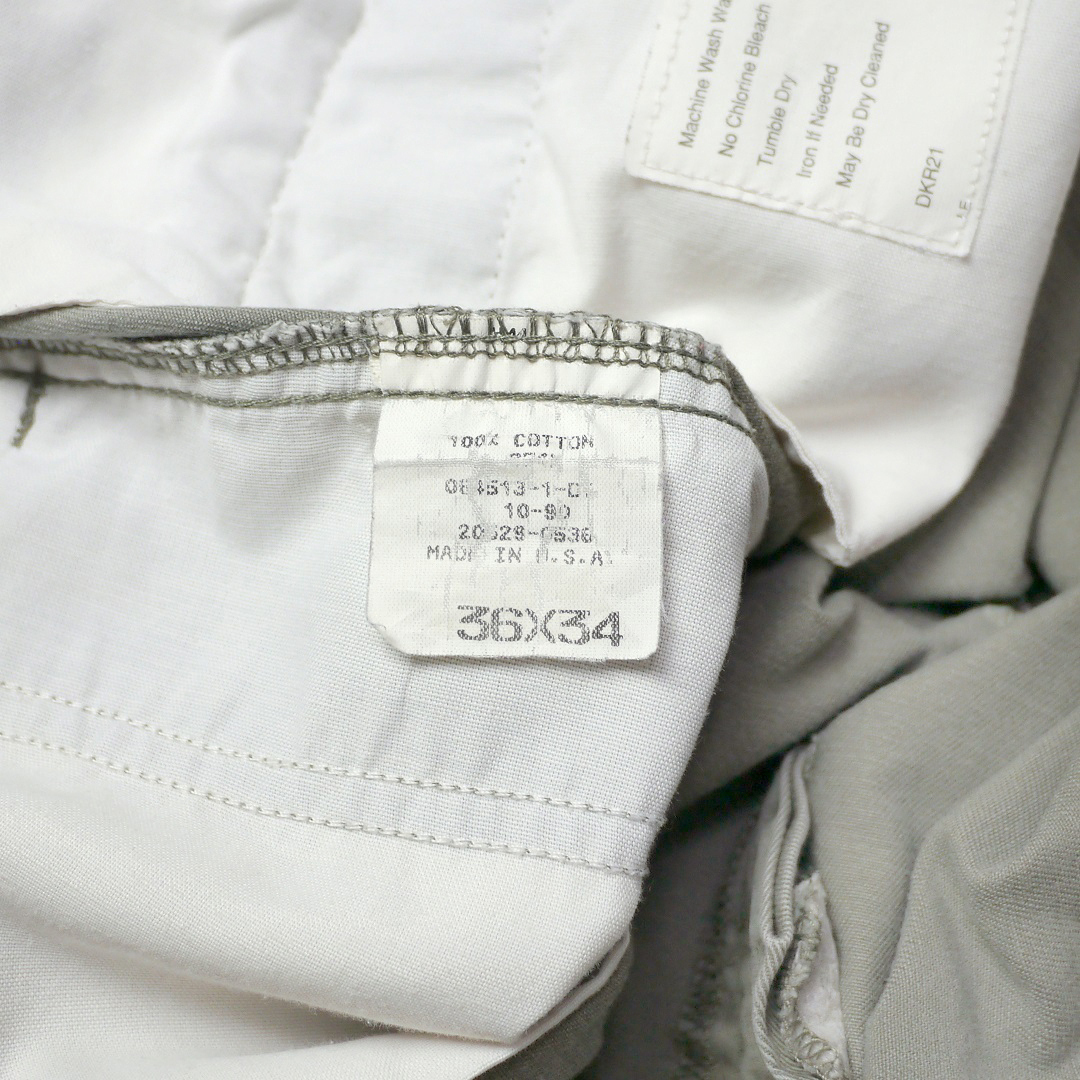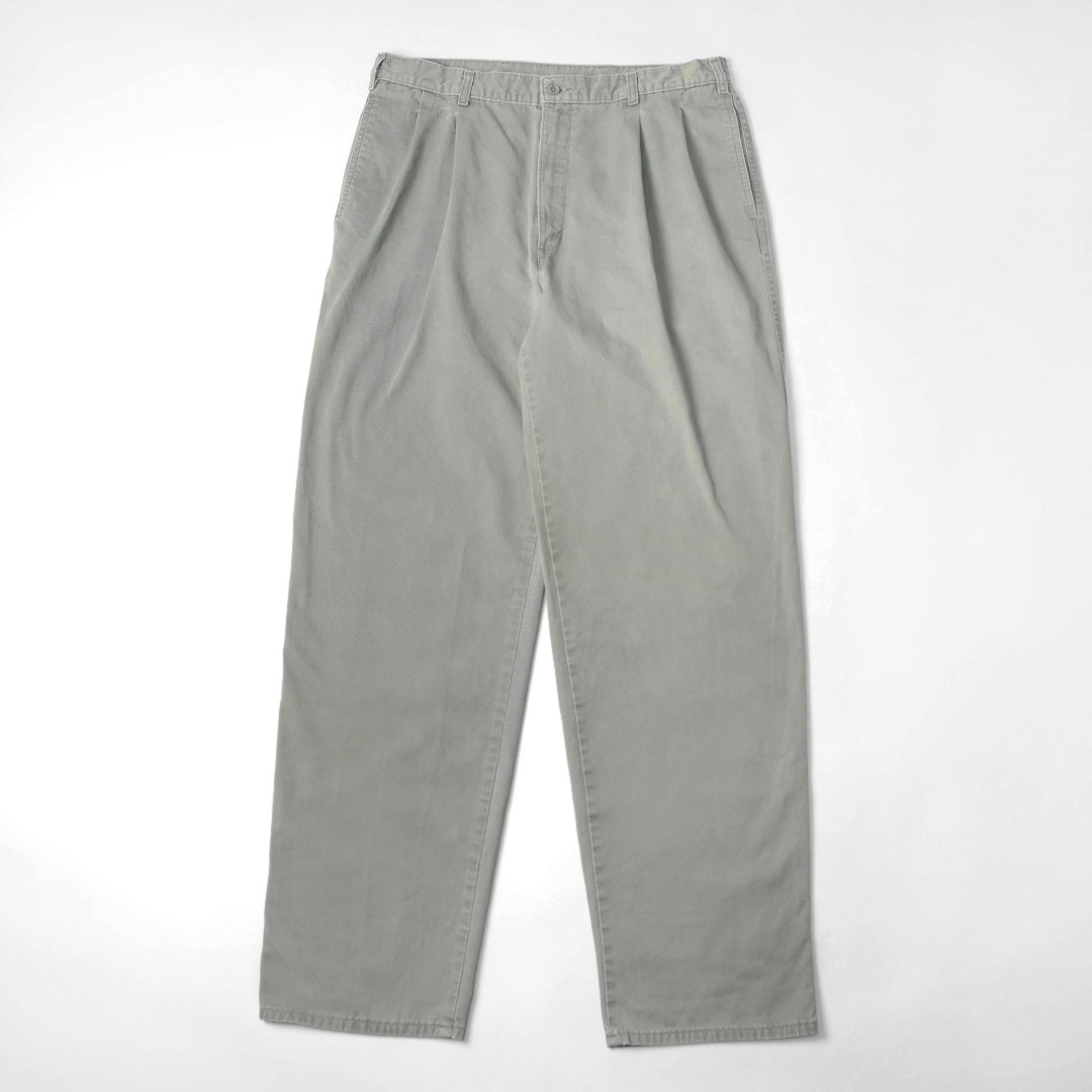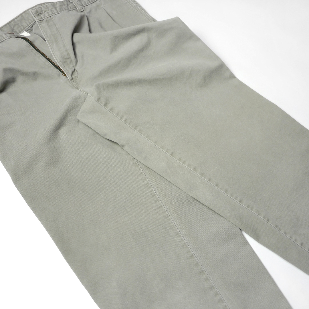 ■ブランド 80s-90s、LEVIS、DOCKERS、MADE IN USA、42TALON ZIP ■素材 100%COTTON ■カラー フェードグレー系、表現が難しいのですがくすんだ感じの灰色になります。 ジッパーテープがグリーンなので元々は薄緑色が混じったような色味だったと思われます。 ■詳細 アメリカで購入したリーバイス/ドッカーズのコットンツイルパンツです。 80年代-90年代(1990年製)、旧タグのアメリカ製でジッパーは42タロンジップになります。 生地はシッカリとしたオールコットン、シルエットはユッタリとしておりツータック入りのテーパードです。 イイ感じに雰囲気よく経年変化しております。 ■状態 コットン特有の色落ち、薄汚れ、フェード、アタリ、スレ、ウェストレーンフチに多少の摩耗、モモやインシームに薄めの線あと(保管によるたたみ焼け?薄汚れ?)、薄めのセンターシームあとあり。 着用に問題あるダメージはなく良好です。 ■サイズ 表記 W36 L34 (実寸W34.5 L32.5 *下記参考下さい) ウェスト 44cm×2 股下 83cm 総丈 112cm 裾幅 22cm 股上前 32cm 股上後 43cm ワタリ 37cm ヒップ 55cm-60cm ■注意事項 状態は細かく確認しておりますが、傷や汚れの見落とし、実寸誤差、色味差異など生じる場合がございます。 不明な点がありましたら入札前にご質問下さい。 商品にあわせて洗濯やクリーニングメンテナンスを施しておりますが、ビンテージやアンティークなど中古品になりますので特性のご理解をお願いします。 |
