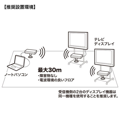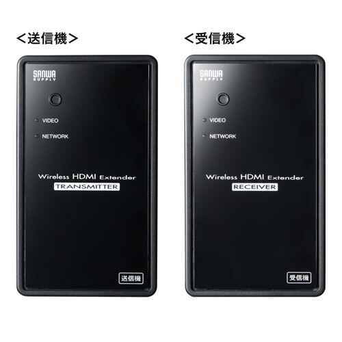 ※配送の送り主はサンワサプライ(株)と記載されています。沖縄・離島配送不可となります。 当店は正規販売代理店です。 特長 HDMI信号をフルHD(1920×1080ドット)解像度で最大30mまで、2か所にワイヤレス分配出力することができます。 ※使用環境によります。 送信機と受信機2台はペアリング済みなので接続するだけで相互リンクを開始します。面倒な設定は不要です。 HDDレコーダーやゲーム機などの映像出力機器と送信機を、液晶テレビやプロジェクターと受信機を接続するだけですぐにワイヤレス化できます。 高画質なHDMI画像信号と同時に高音質な音声信号もワイヤレスで延長できます。 3D映像・フルハイビジョンの高画質映像に対応しています。 5GHz帯の無線伝送規格技術を採用しており、長距離伝送でも安定してHDMI信号(映像・音声)の送受信が行えます。 赤外線リモコンもワイヤレスで送受信できるため、離れた場所にいたまま送信機側の機器を操作することができます。 メーカー保証期間365日 ※当店発注日からになります 気をつけておりますが、タイミングによっては在庫切れの場合があります。 HDCP(High-bandwidth Digital Content Protection)対応製品です。 ※ディスプレイ、出力機器もHDCPに対応している必要があります。 技術基準適合証明(TELEC認証)取得済みです。 <ご注意> ※分配出力する2台のディスプレイ機器については同一機種を使用することを推奨します。異なる機種を使用した場合、ディスプレイ認識の差異により正常に出力できない場合があります。 ※本製品は同一部屋内での複数セット(送信機×2台、受信機×4台など)使用はできません。電波が干渉し正常に送信機・受信機間が認識できなくなります。 ※隣接する部屋同士の場合も電波が干渉する距離範囲内の場合は1セット(送信機×1台、受信機×2台)しか使えないことがあります。 ※本製品は送信機・受信機が個々にペアリングされているため、ペアリング外の機器と混信することはありません。 ※すべての機器での動作を保証するものではありません。 仕様