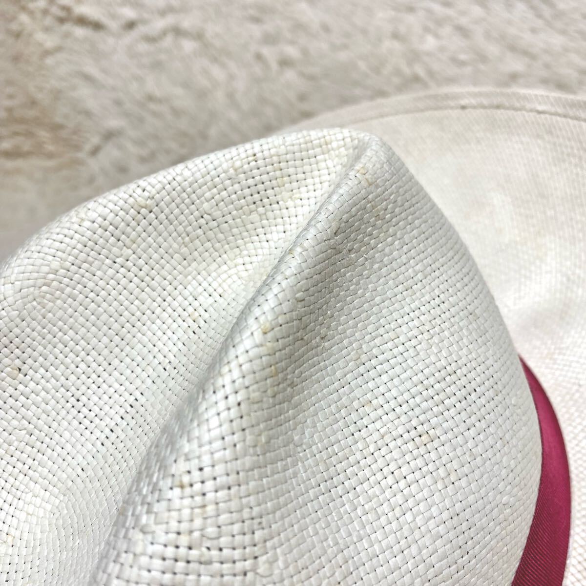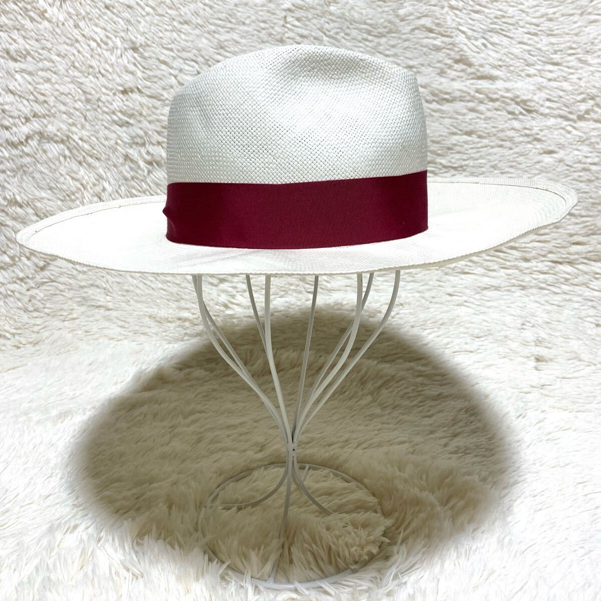 気品漂うホワイト系カラーのクラウンに、深紅のリボンを添えたコントラストは、洗練と華やぎを兼ね備えた佇まい。ワイドブリムが放つ堂々たる存在感は、ただの日除けではなく、装いに「格」をもたらすアイテム。