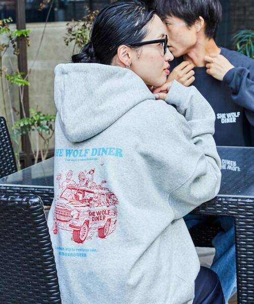 参考商品名:限定展開 SHE WOLF DINER×FREAK’S STORE/シーウルフダイナー 別注 ビッグシルエット バックプリント POパーカー/フーディー/CAR