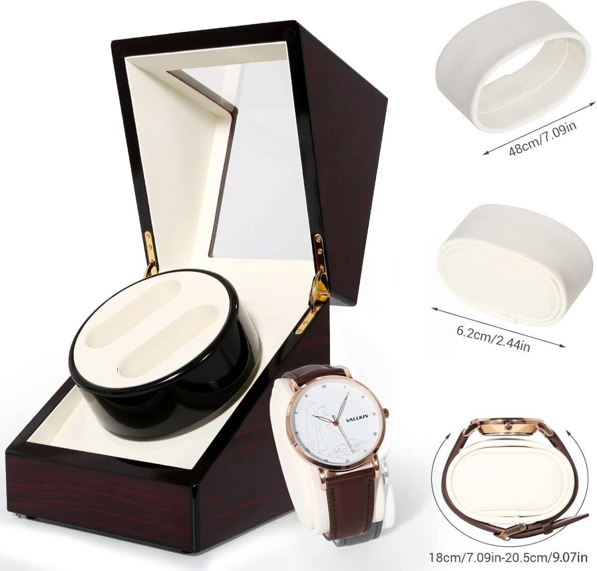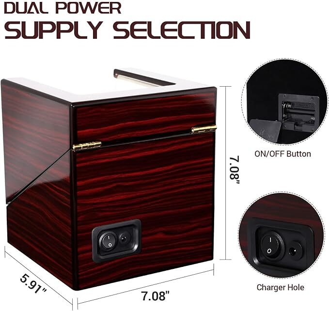 木製仕上げの時計ワインダーは、2 つの腕時計をゆっくりと自動的に巻き上げます。最初に時計回りに 2 分間回転し、6 分間休止し、次に反時計回りに 2 分間回転し、6 分間休止し、このサイクルを繰り返します。