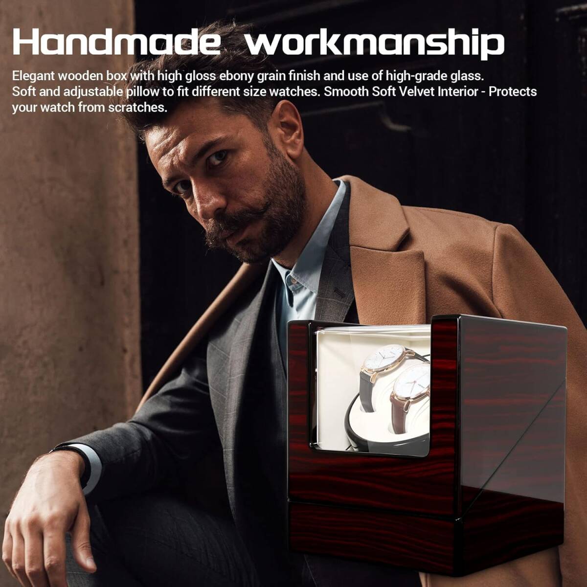 デュアルオートマチックウォッチワインダーは、コンパクトな幾何学的な形状で、時計を埃から守るカバーが付いています。手作りの無垢材と高級ピアノ焼き付けニスで作られており、鑑賞やディスプレイに最適です。