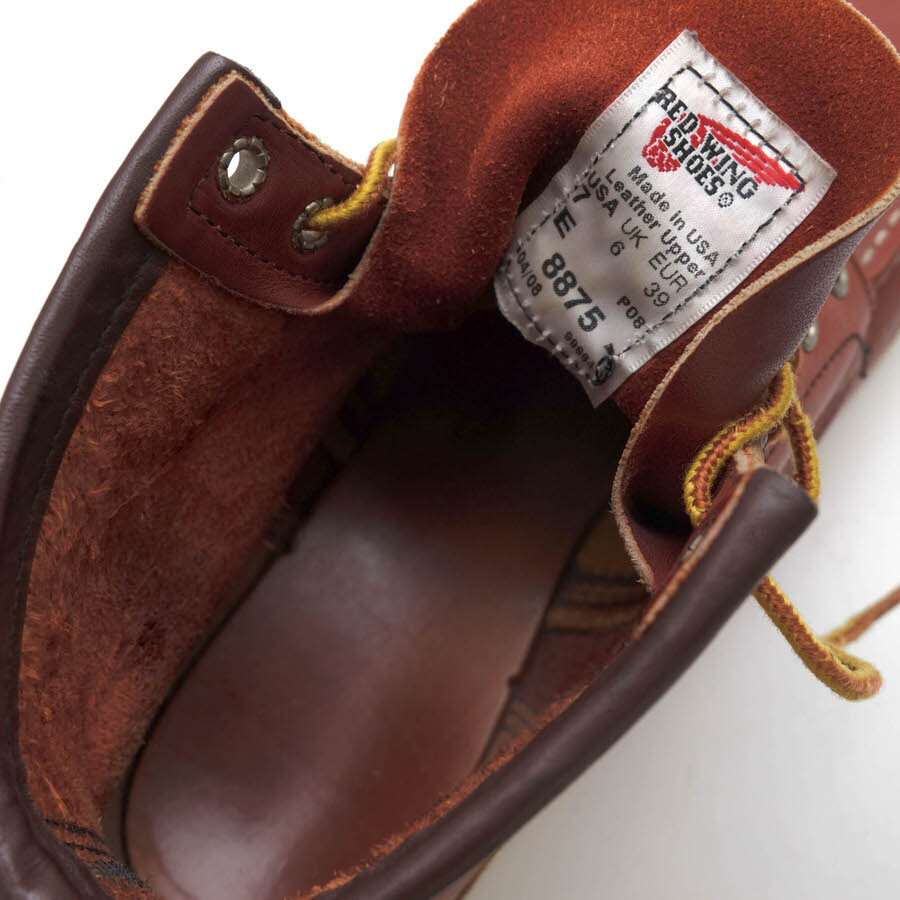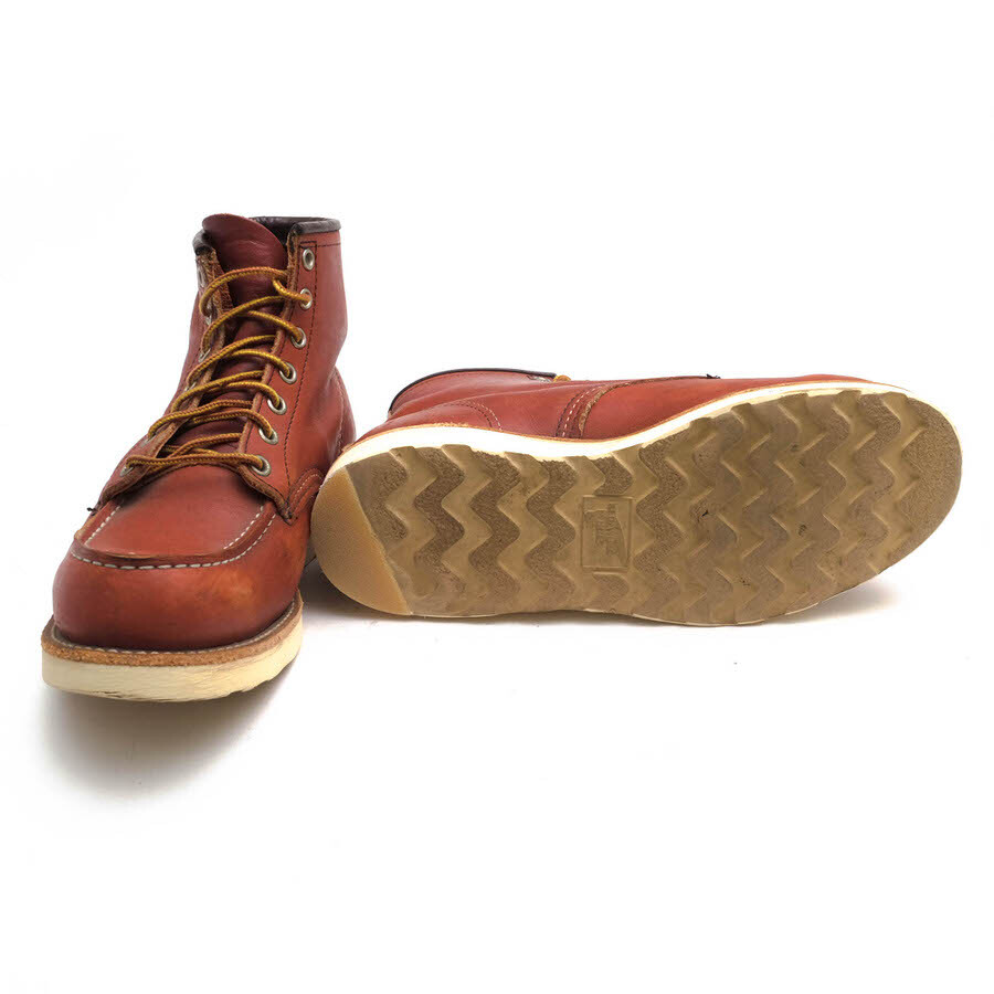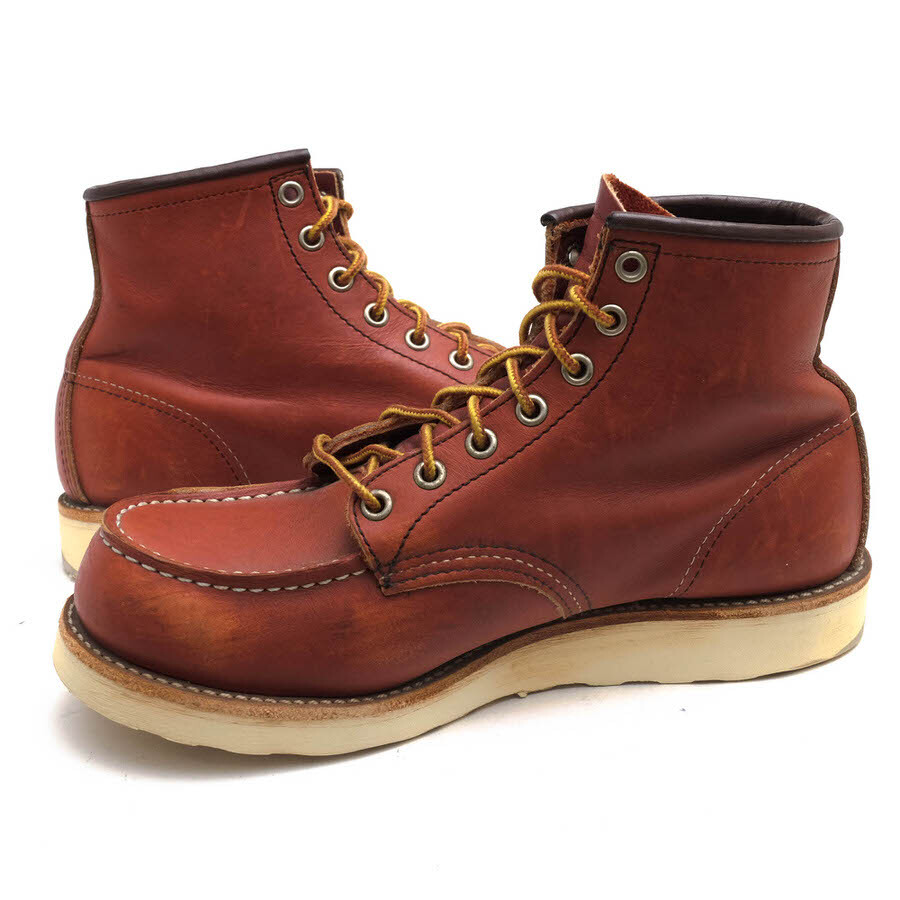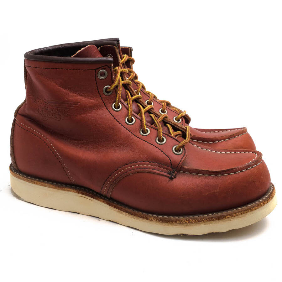 トゥのU字型のステッチが特徴で、RED WINGを代表するモデル「8875 6inch CLASSIC MOC TOE」。オーセンティックブラウンと呼ばれる薄めの茶色のカラーを、赤みの強いオロ・ラセットに替えた日本別注。モカシントゥになっているので足先にゆとりを持たせ、履きこむほどに味わいを深める赤みがかったブラウンカラーが美しい逸品です。 |