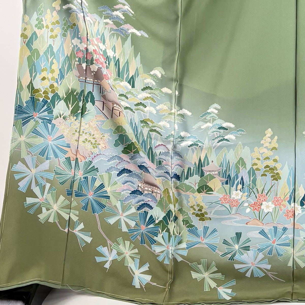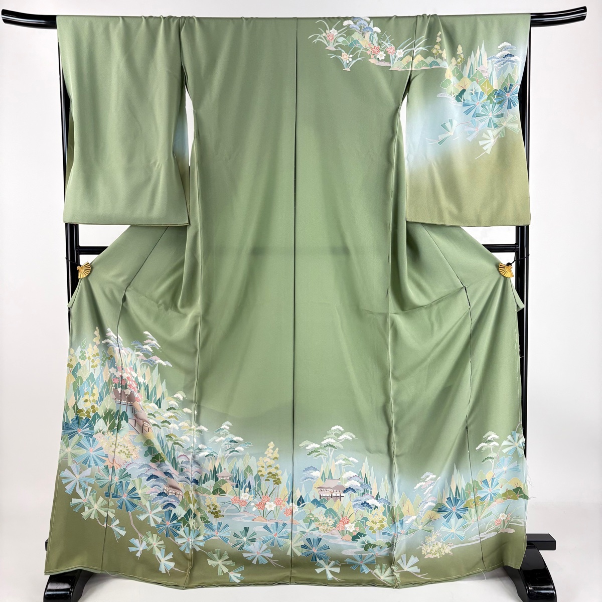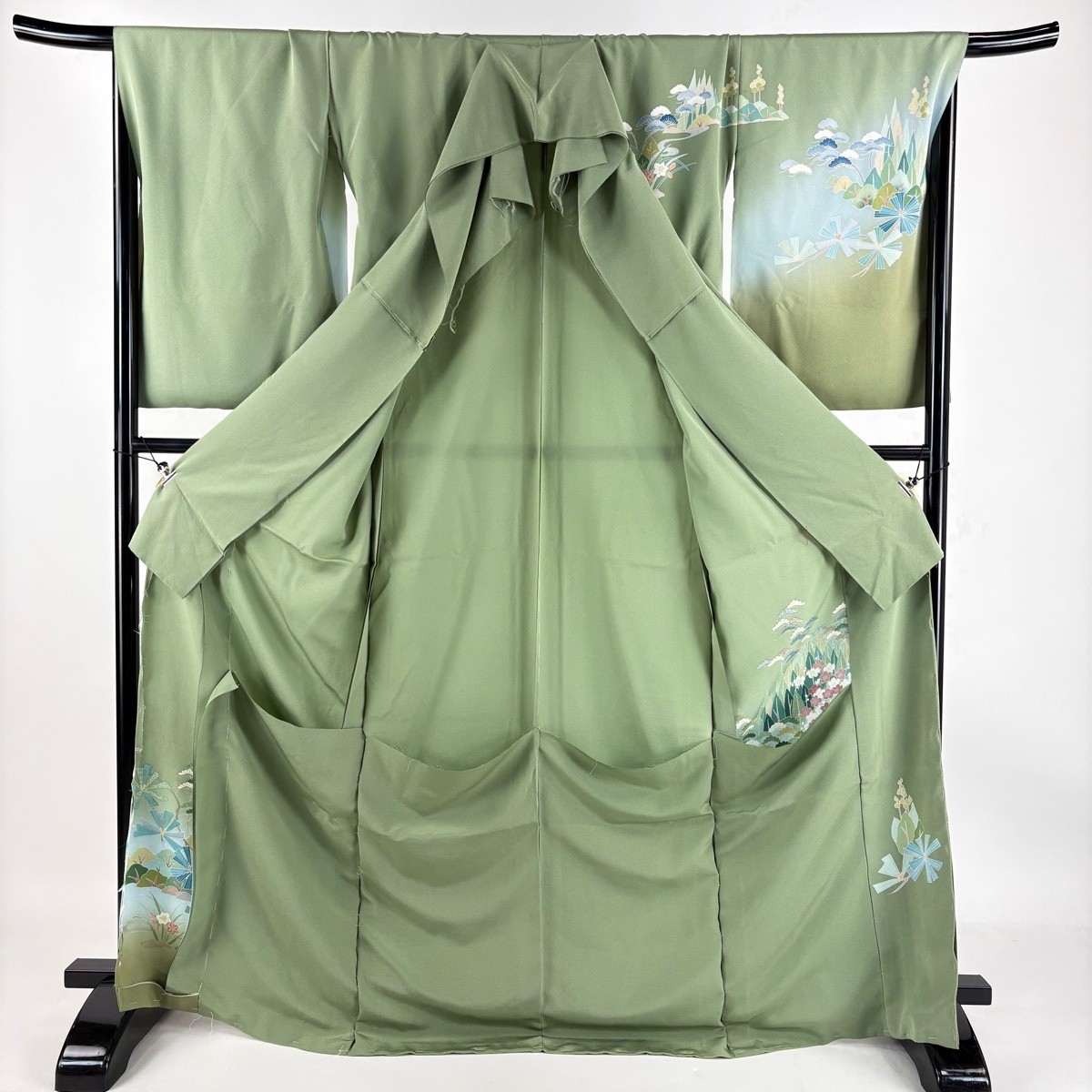 | 訪問着 秀品 仮絵羽 家屋 松梅 染め分け ぼかし よもぎ色 未仕立て 身丈171.5 裄丈70 正絹 【中古】 |