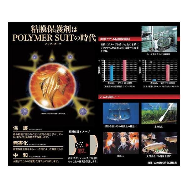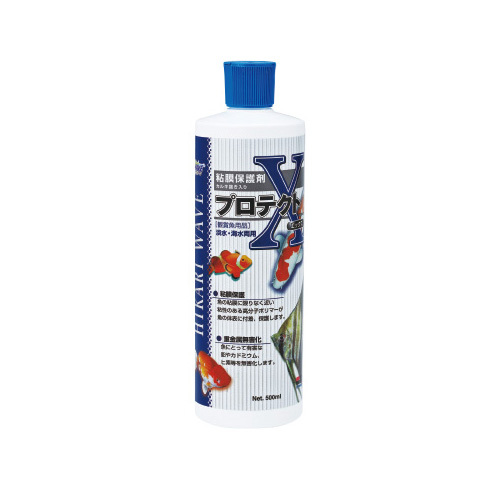 高分子ポリマーにより粘膜を保護粘膜にダメージを受けた魚に使用した場合、斃死率が低下する結果がキョーリン研究所の調べで明らかになりました。商品特徴 1.魚の粘膜に近い成分の高分子ポリマーが傷ついた魚の体表を保護します。 2.水道中の塩素を中和します。(500mlのみの性能となります。)3.有害な重金属を無害化します。4.新しく魚を購入した際や、採取した魚など粘膜に傷がついた魚に効果的です。※魚の表面のヌルっとした感じ。このヌルっと感が特殊ポリマーの感触です! 【試験方法1】 粘膜を50%近く損傷したコンゴテトラの水槽に プロテクトXを投入。【試験方法2】 輸送によりダメージを負ったバラタナゴの水槽に プロテクトXを投入。※明らかなデータ結果として粘膜に物理的なダメージを受けた後、プロテクトXを使用すると生残率が向上します。使い方 新しく購入した魚や採集した魚など粘膜に傷がついた魚を水槽に入れる際は水槽の水量に応じて使用してください。 水換え時は交換した水量に応じて使用してください。 20mlにつき5mlを使用して下さい。500mlのキャップは、1杯5ml、業務用のキャップは10mlです。