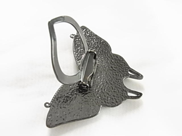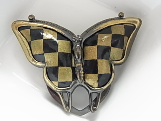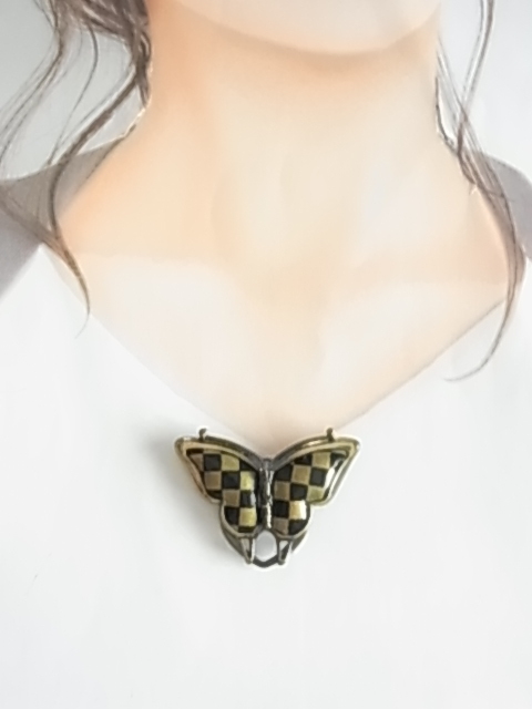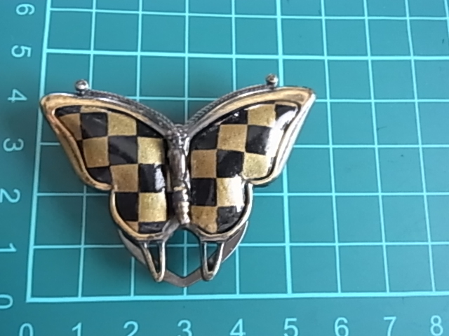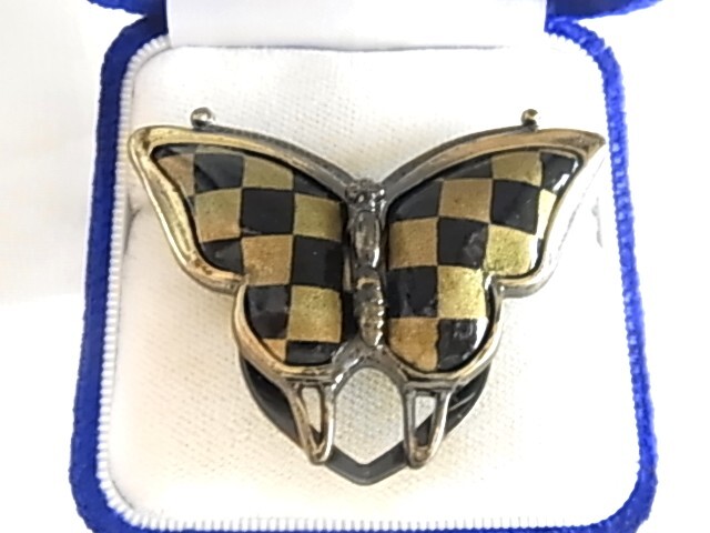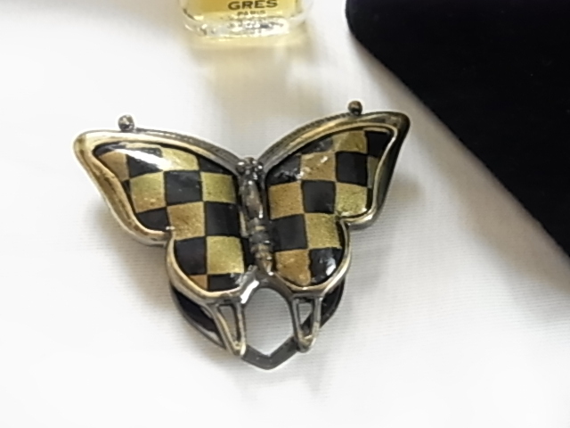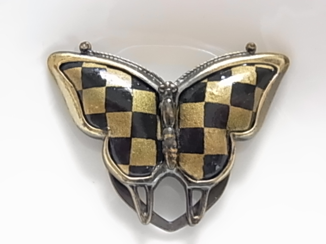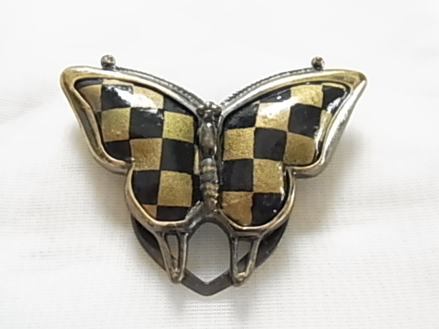 ビンテージ/ヴィンテージ和モダン 市松文様の羽の蝶々モチーフ バタフライデザイン 蝶 金色トーンと黒トーンレトロスカーフクリップ★
